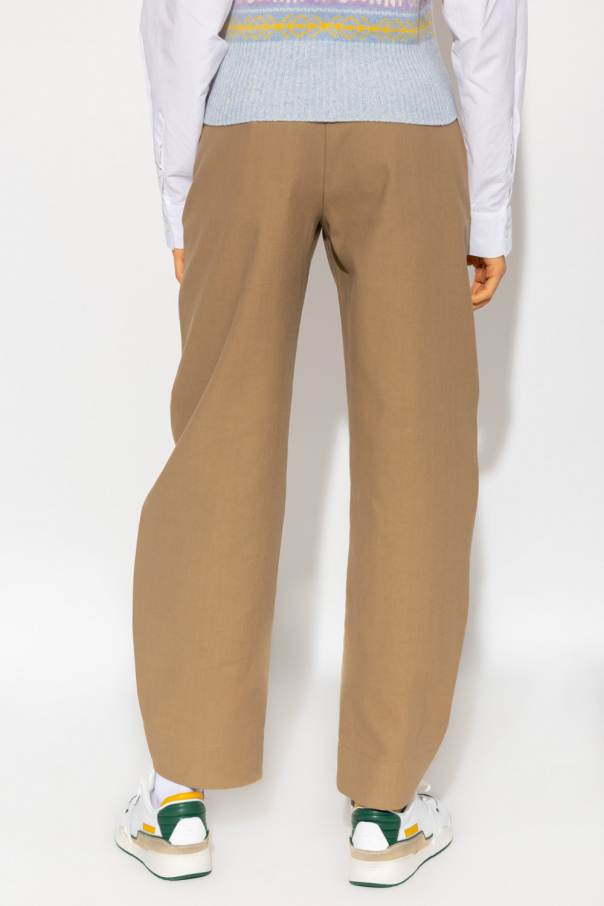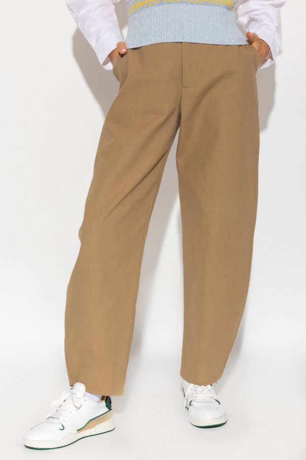 Light brown trousers from Ganni. Crafted from organic cotton, this pair falls with straight legs and features a zip fly with a button and three slip pockets.