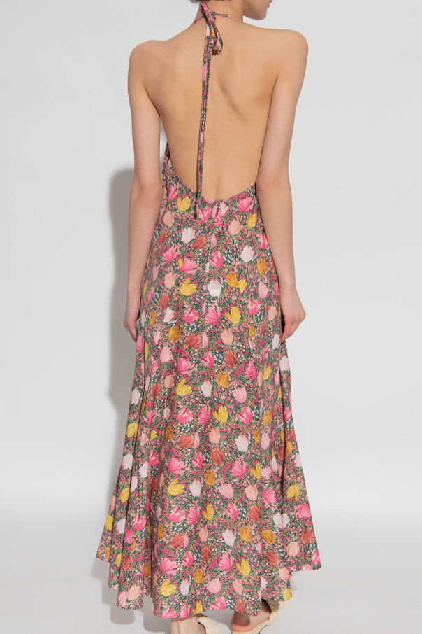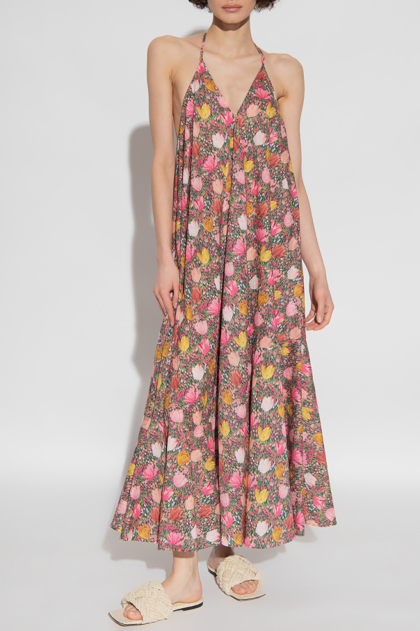 Multicolored ‘Lydon’ off-the-shoulder dress from Birgitte Herskind. Made of organic cotton, this loose-fitting design features criss-cross straps at the back, floral print and V-neck.