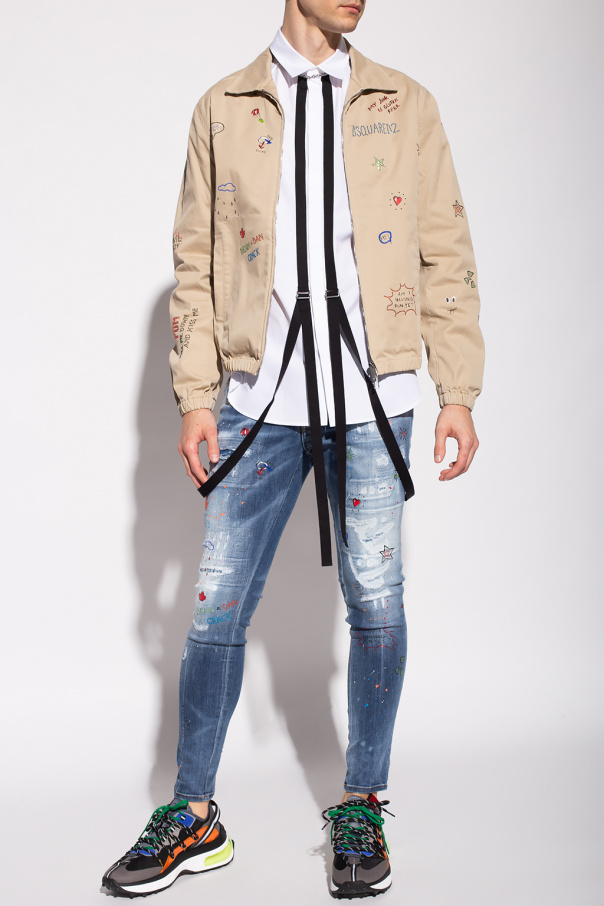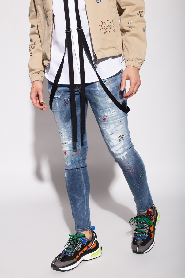 Blue ‘Super Twinky Jean’ distressed jeans from Dsquared2. Fastened with buttons, this tapered leg design features a multicolored paint splatter effect and print, sequins, three front pockets and two back pockets.