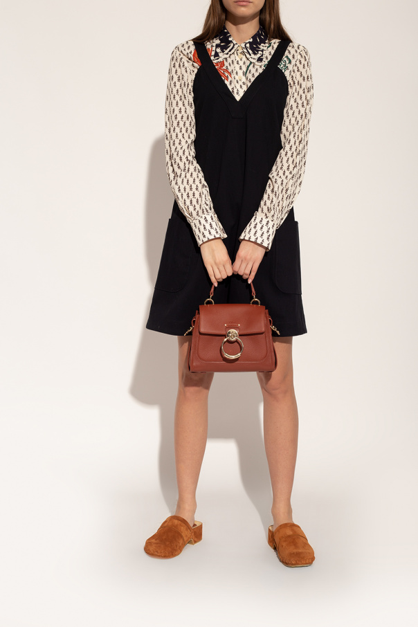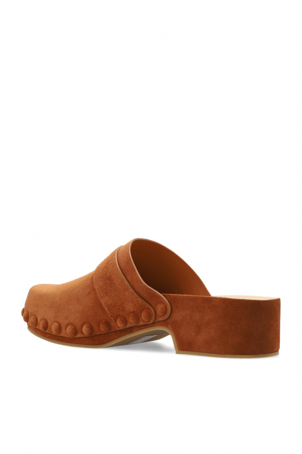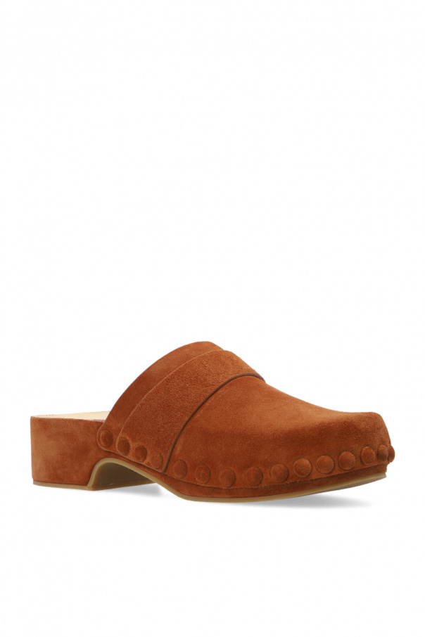 Brown ‘Joy’ slides from Chloé. Made of suede and decorated with suede-covered studs, this model sits on a suede-trimmed beige sole.