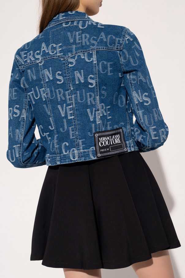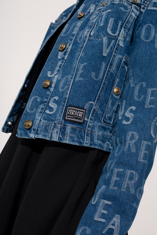 Blue denim jacket from Versace Jeans Couture. Fastened with buttons. Decorated with a white embroidered logo. Black and white logo patch on the back. Four pockets: Two slip pockets and two fastened with a snap. Sleeves finished with a cuff fastened with a button.
