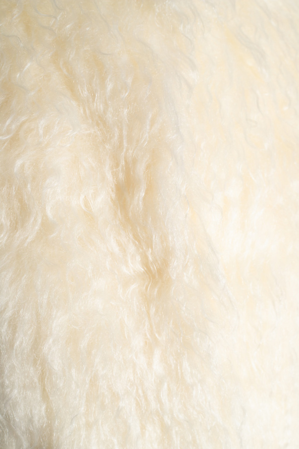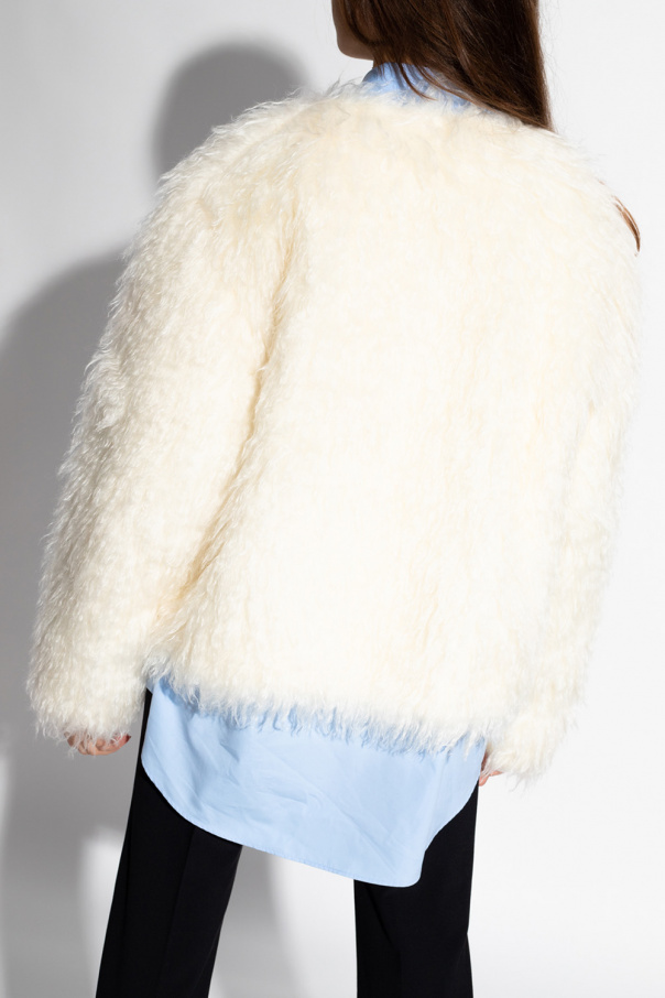 Cream furry jacket from Ami Alexandre Mattiussi. Crafted from a mohair and cotton blend, this round neck design fastens with hooks and is complete with two slip pockets.