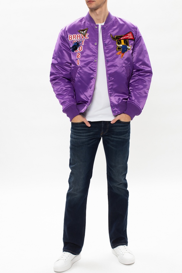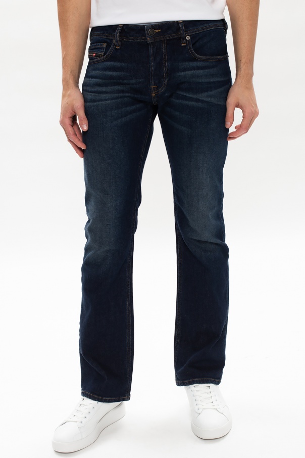 Blue 'Zatiny' jeans from Diesel. Crafted from stretchy cotton denim with distressed effects, this pair falls down with straight legs and showcases yellow seams, ruched details, logo patches, a button fastening and classic five pockets.