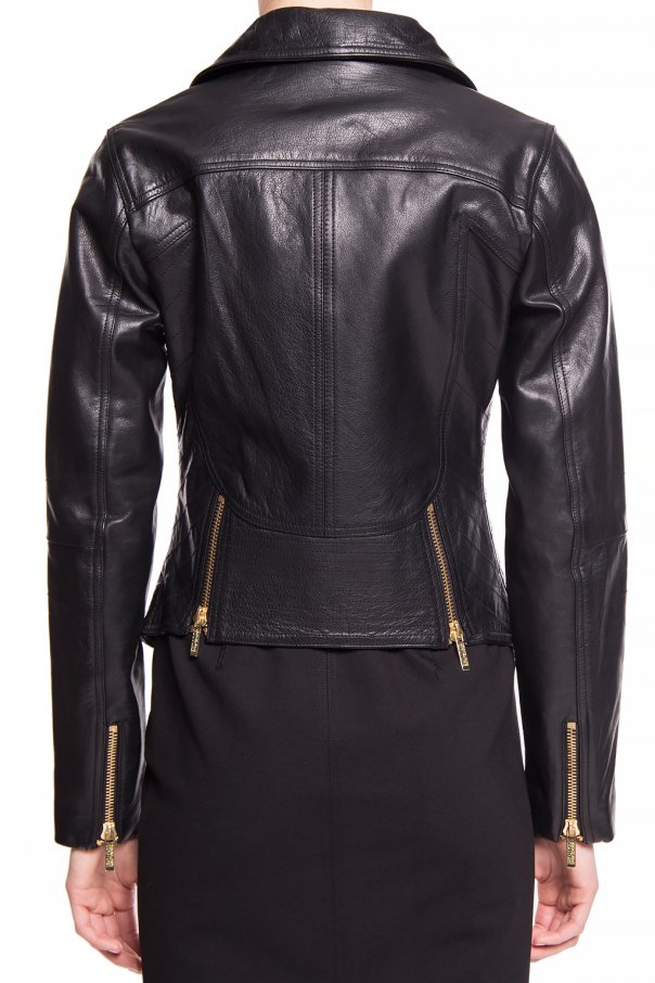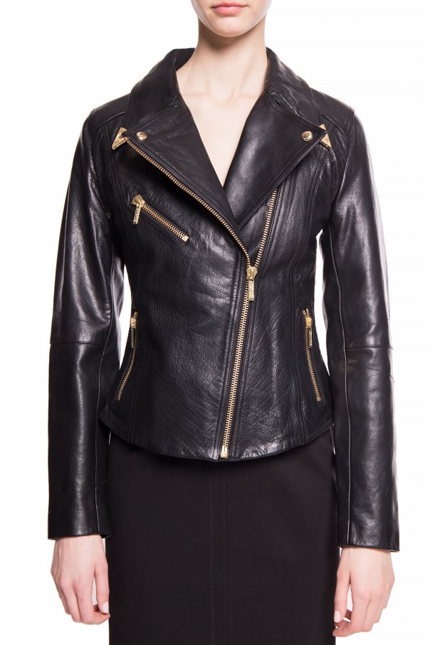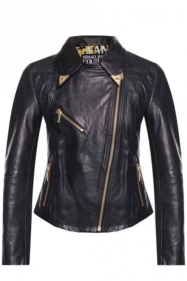 Black biker jacket from Versace Jeans Couture. Made of leather. Zip fastening. 3 zip pockets on the front. Long sleeves with sewn-in zippers. Gold-tone metal hardware featuring an embossed logo.