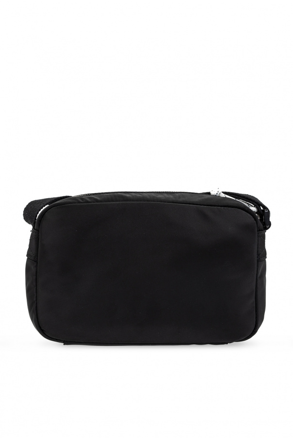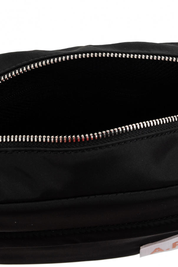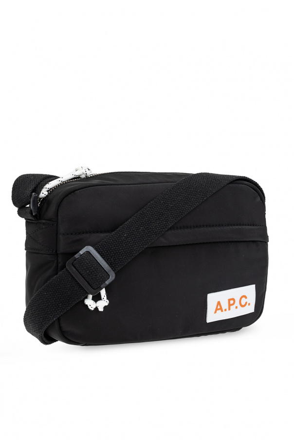 Black shoulder bag from A.P.C. Emblazoned at front with a white patch with an orange logo, this design features a zip fastening, an adjustable shoulder strap and one internal compartment with a zip pocket.