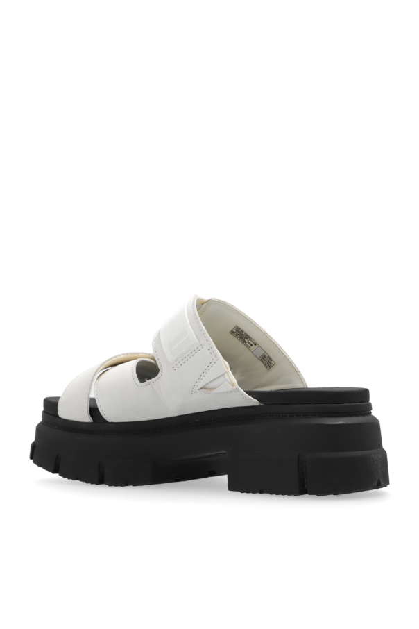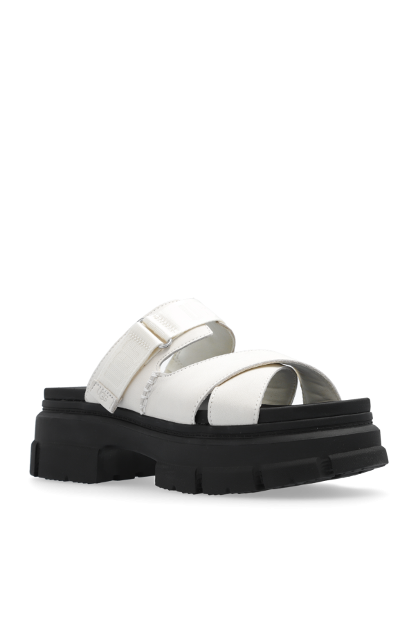 Cream ‘Ashton’ platform slides from UGG. Made from leather, this model sits on a black rubber sole and showcases an adjustable velcro strap decorated with the brand\'s logo.