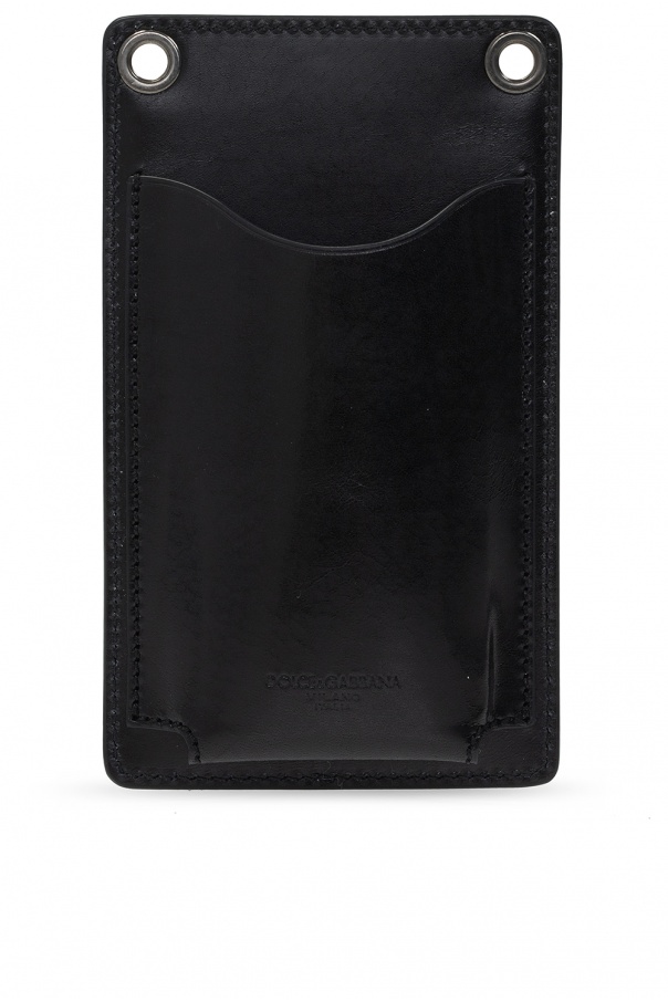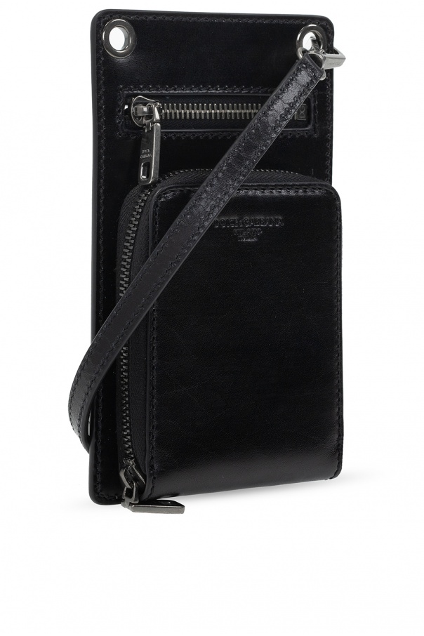 Black pouch from Dolce & Gabbana. Crafted from leather, this item features zip fastenings, a front zip pocket, phone holder at the back, embossed logo, detachable and adjustable strap as well as one internal bill compartment with eight card slots.