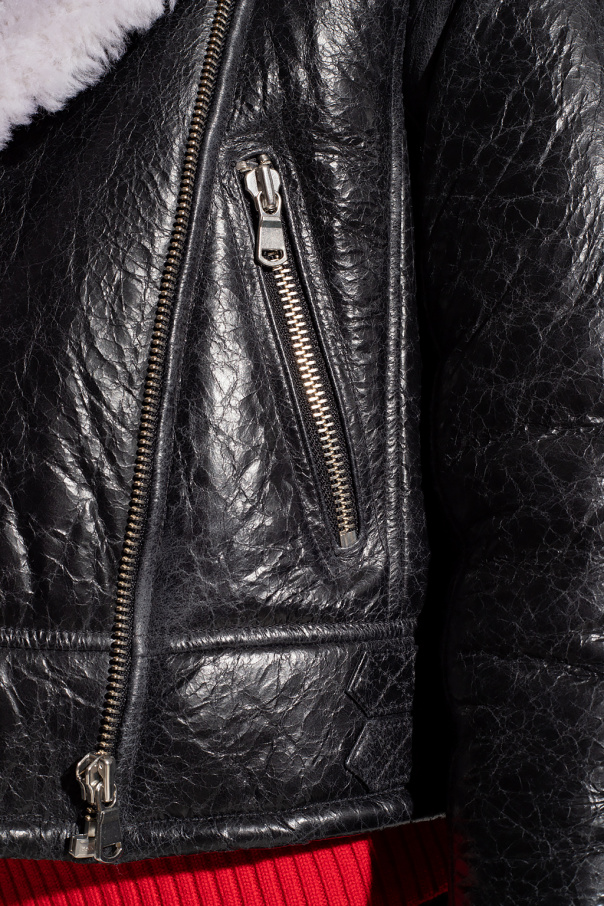 Black shearling jacket from Yves Salomon. Made of lamb leather, this design features a zip fastening, cracked effect, two zip pockets and fur trims.