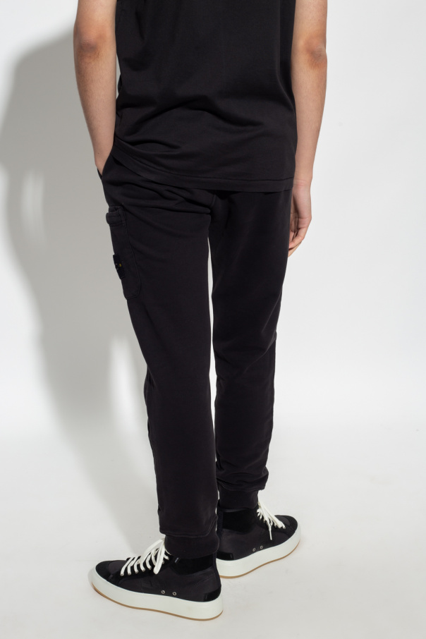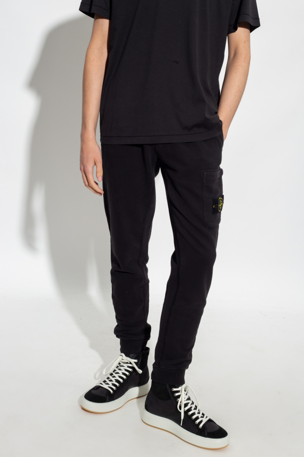 Black sweatpants from Stone Island. Made of cotton and decorated with a black, green and yellow logo patch, this pair features a drawstring waistband, two slip pockets, one snap-fastened pocket, one zip pocket and elasticated cuffs.