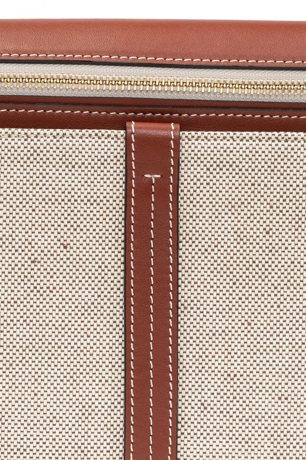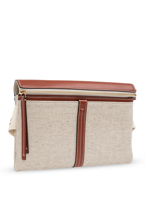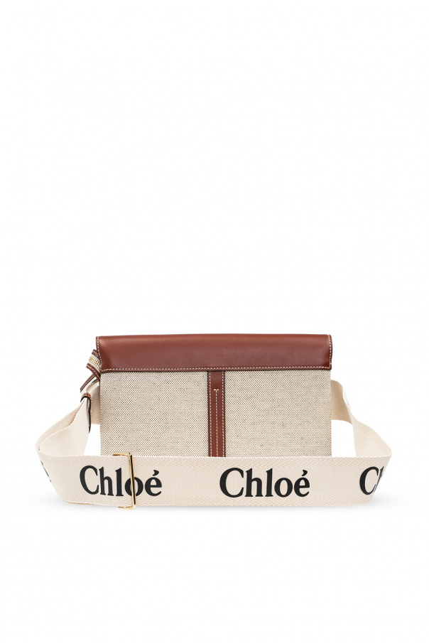 Beige and brown ‘Woody’ belt bag from Chloé. Crafted from cotton and trimmed with calf leather, this design fastens via a zip and features two slip pockets on the front, an adjustable strap with a black logo print, gold-tone metal hardware and an interior with two separate compartments.