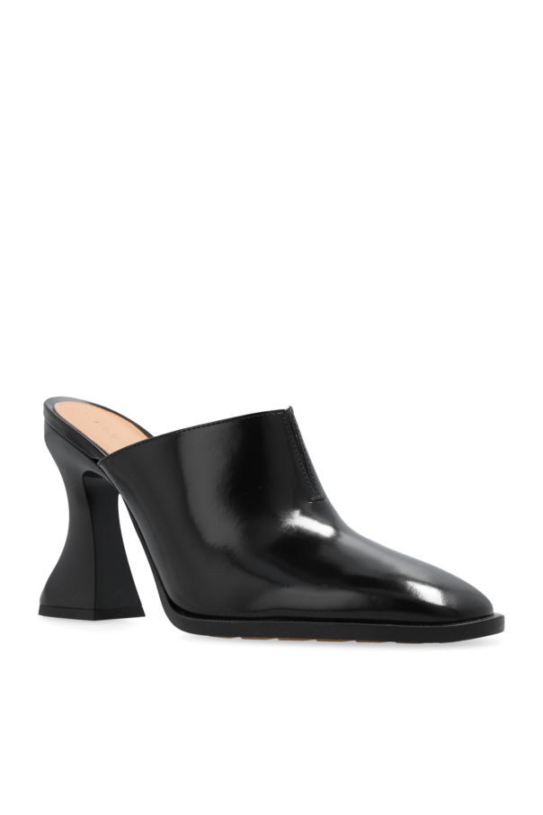 Introducing the \"Cha-Cha\" heels, a distinguished offering from the exclusive Bottega Veneta collection. These black mule-style heels exude a timeless elegance, crafted from high-gloss calfskin leather that captures and reflects light, ensuring they stand out with a luxurious sheen. The unique tulip-shaped heel, broad at the base and tapering gently upwards, not only serves as a striking visual feature but also enhances stability, making them a perfect blend of form and function. The Cha-Cha heels feature a rounded toe and an open back, embodying the essence of modern sophistication. The interior is lined with soft leather in a contrasting light shade, offering a plush feel against the skin. Notably, the absence of visible branding or logos speaks to a minimalist design ethos, allowing the shoes\' distinctive silhouette and lustrous material to take center stage. A discreet slit at the front adds an element of intrigue, while the beige leather sole is equipped with anti-slip rubber inserts, promising improved traction and durability. Why Purchase the \"Cha-Cha\" Heels? Elegance and Shine: High-gloss calfskin leather provides a striking appearance that elevates any ensemble. Unique Stability: The tulip-shaped heel offers an unparalleled blend of stability and style. Exquisite Comfort: Luxurious leather lining ensures comfort for extended wear. Minimalist Design: The absence of overt branding highlights the shoes\' elegant silhouette and quality materials. Enhanced Durability: Beige leather sole with anti-slip rubber inserts for lasting wear and improved grip.