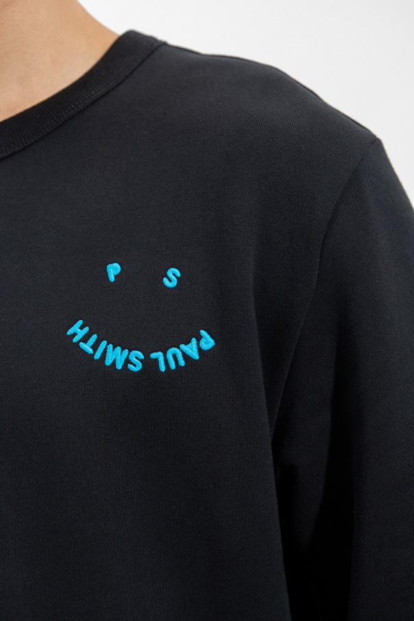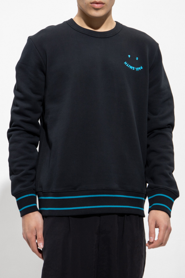 Black sweatshirt from PS Paul Smith. Made of cotton from sustainable, organic farms, this garment features a blue Happy logo embroidery and ribbed trims with blue stripes at the hem and cuffs.