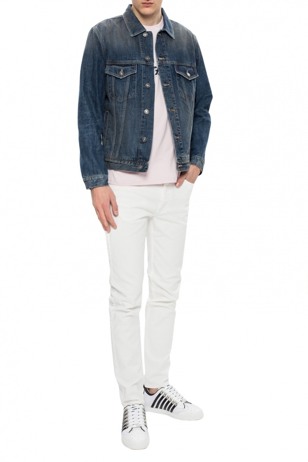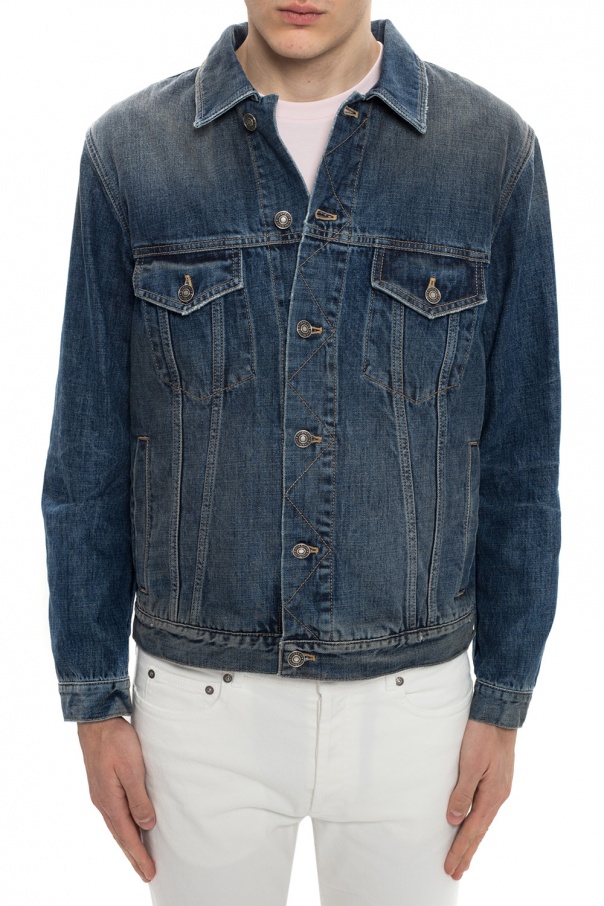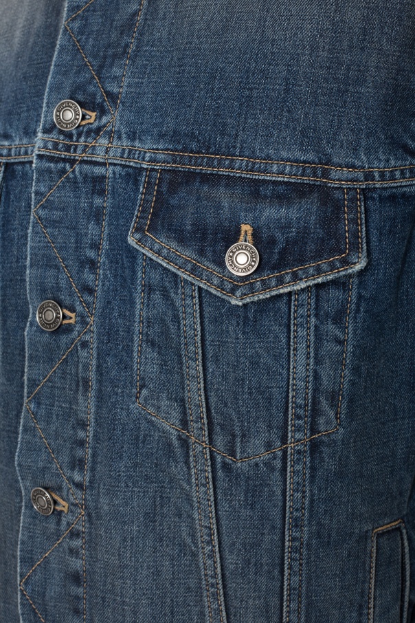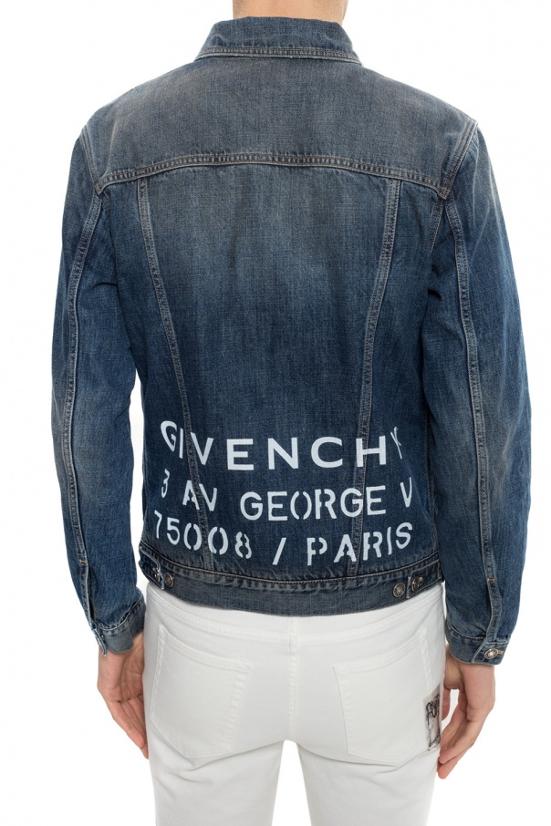 Blue denim jacket from Givenchy featuring button fastening, two buttoned flap pockets and two slip pockets on the front as well as printed white brand's logo on the back.