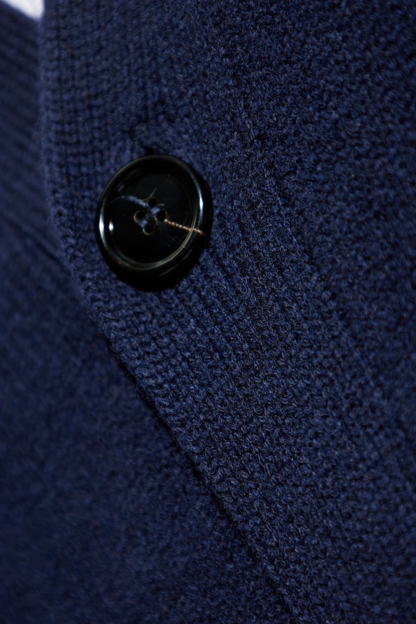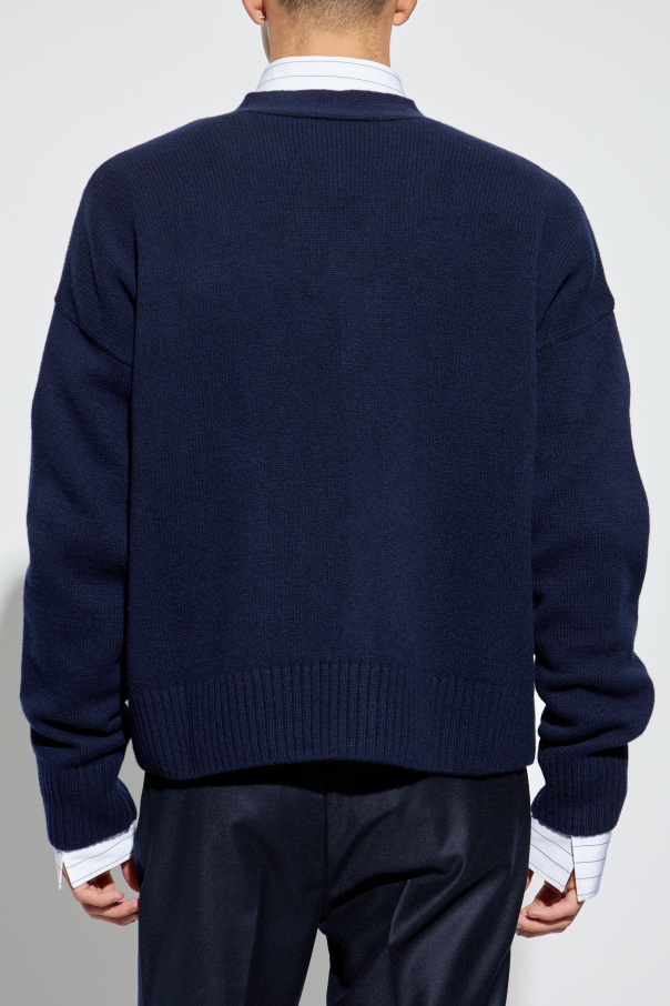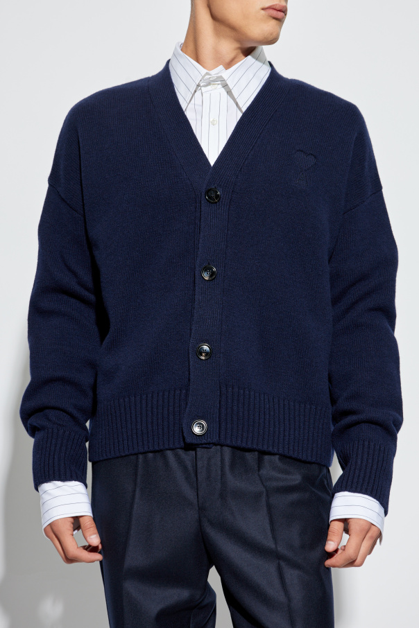 Introducing the Wełniany Cardigan by Ami Alexandre Mattiussi, a paragon of sartorial elegance and sophisticated craftsmanship. This exquisite navy cardigan, meticulously crafted from premium wool and cashmere, epitomizes comfort and style. The cardigan boasts a classic silhouette with long sleeves and a deep V-neckline. Its relaxed fit offers an effortless yet refined look, making it a versatile addition to any wardrobe. Constructed from high-quality materials, the fabric feels luxuriously soft and delicate while ensuring durability and warmth. The cardigan is adorned with four large, dark buttons that perfectly complement its rich, deep navy hue. A subtle logo or embroidery on the left chest adds a touch of elegance and brand distinction. The sleeves and hem are finished with ribbed cuffs, imparting a neat and polished appearance. This versatile piece is styled effortlessly with a white shirt and various trousers, showcasing its adaptability for both casual and formal ensembles. Why Buy This Product? Exquisite blend of wool and cashmere for unparalleled comfort Classic design with a deep V-neckline and relaxed fit Elegant detailing with dark buttons and subtle logo Versatile navy color suitable for various occasions Expertly crafted by the renowned Parisian brand AMI
