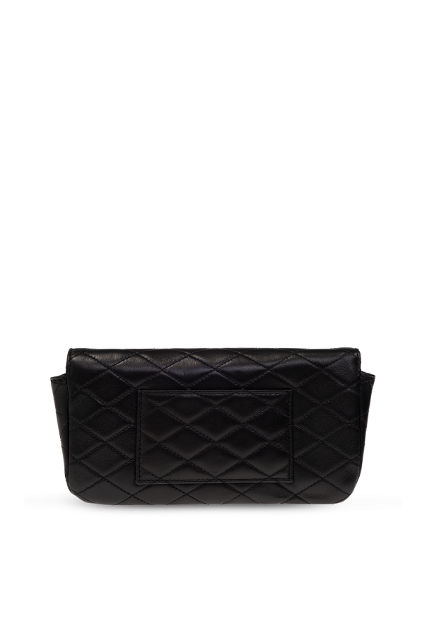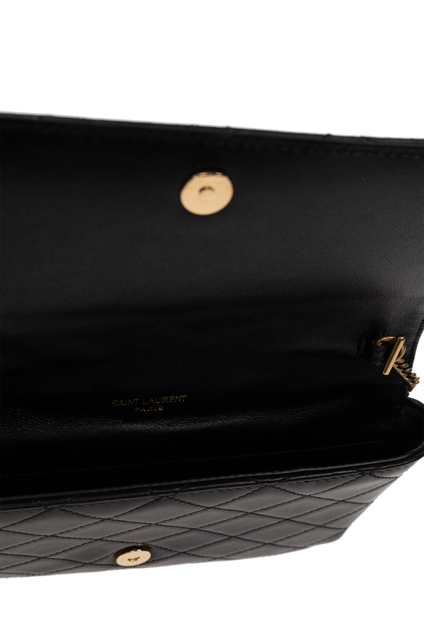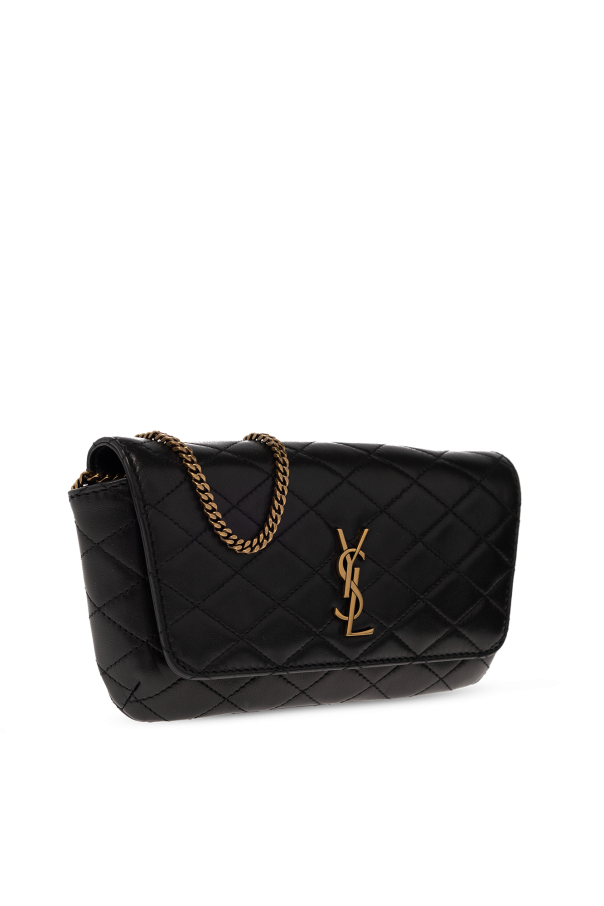 Black ‘Gaby’ phone holder from Saint Laurent. Made of quilted lamb leather, this design secures with a magnetic snap and showcases a metal logo plaque on the front. It is complete with a detachable chain shoulder strap, one back slip pocket, one internal compartment and antiqued gold-tone metal hardware.