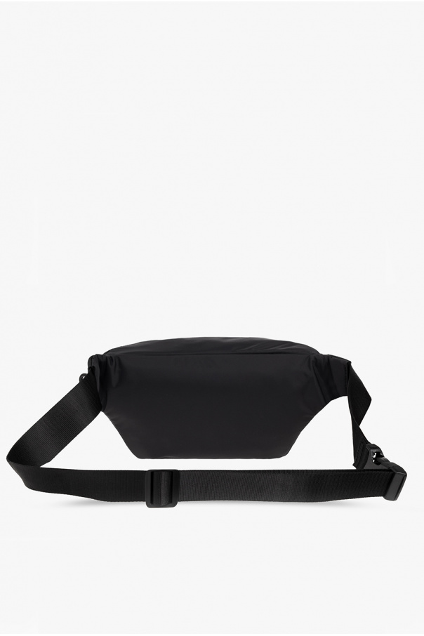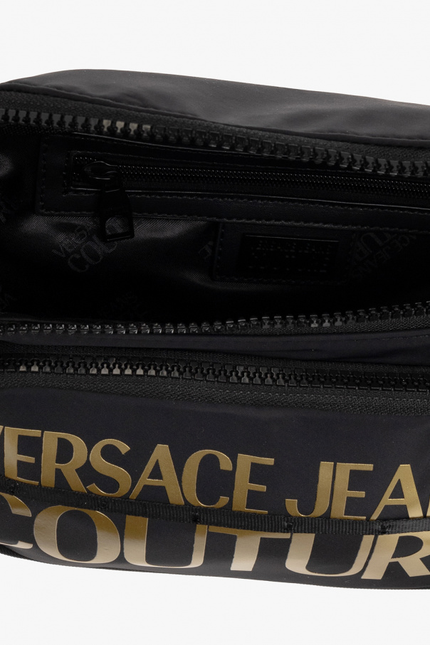 Black belt bag from Versace Jeans Couture. This model features a zip fastening, front zip pocket, gold-tone logo print, adjustable shoulder strap and one internal compartment with one slip pocket and one zip pocket.