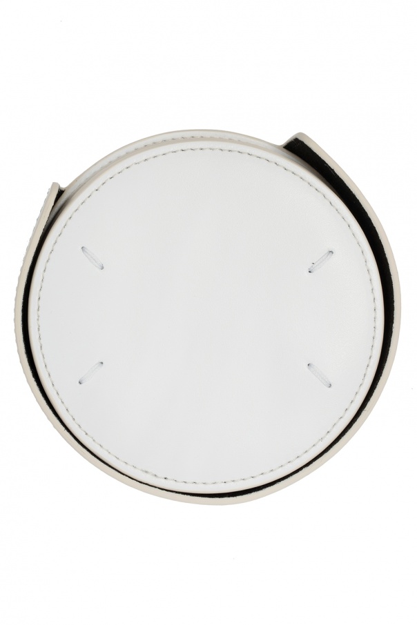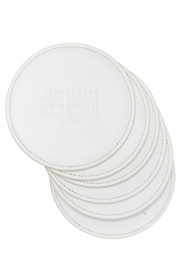 Set of six white coasters from Maison Margiela. Crafted from cow leather, they come in a case and showcase an embossed logo and the signature four-stitches moniker.