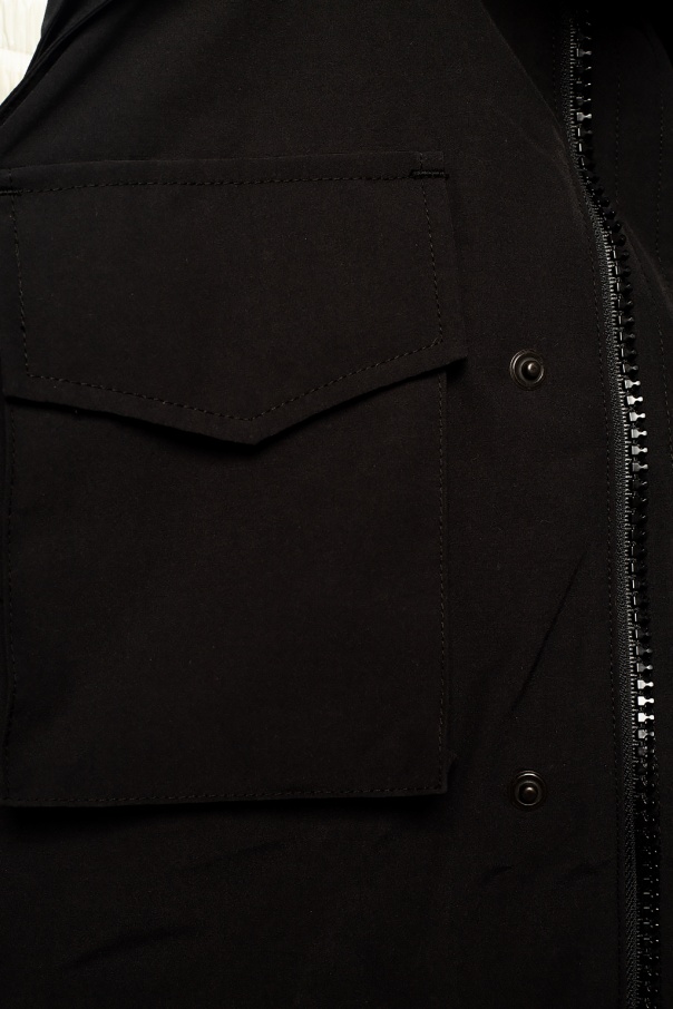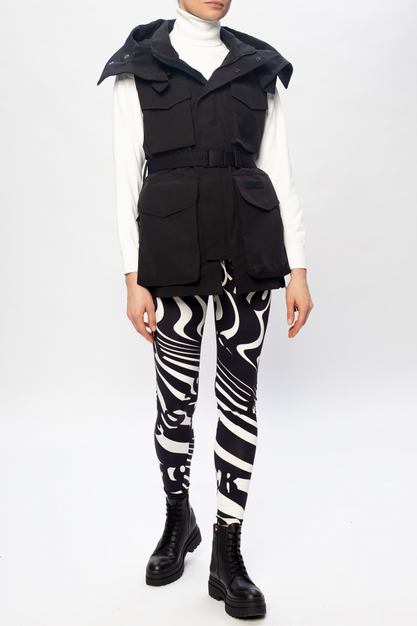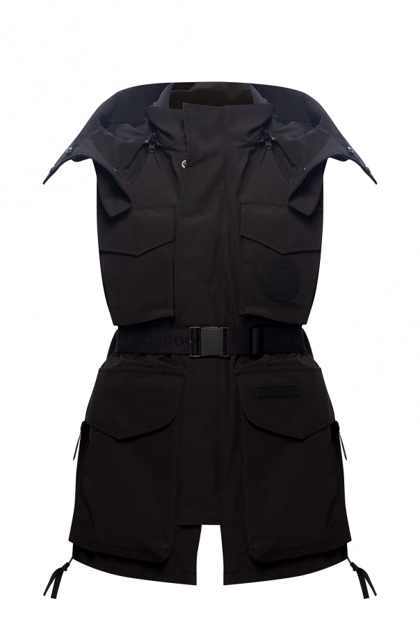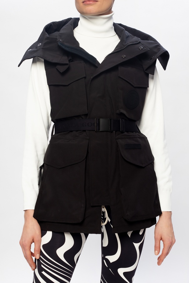 Black ‘Chaka Vest’ vest from Canada Goose x Angel Chen fastened with a two-way zip and snaps, this garment features a four pockets fastened with snaps and velcro, a belt embroidered with a logo pattern, decorative black patch, detachable hood and zips on the sides.