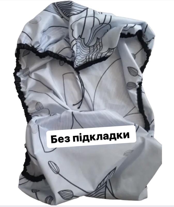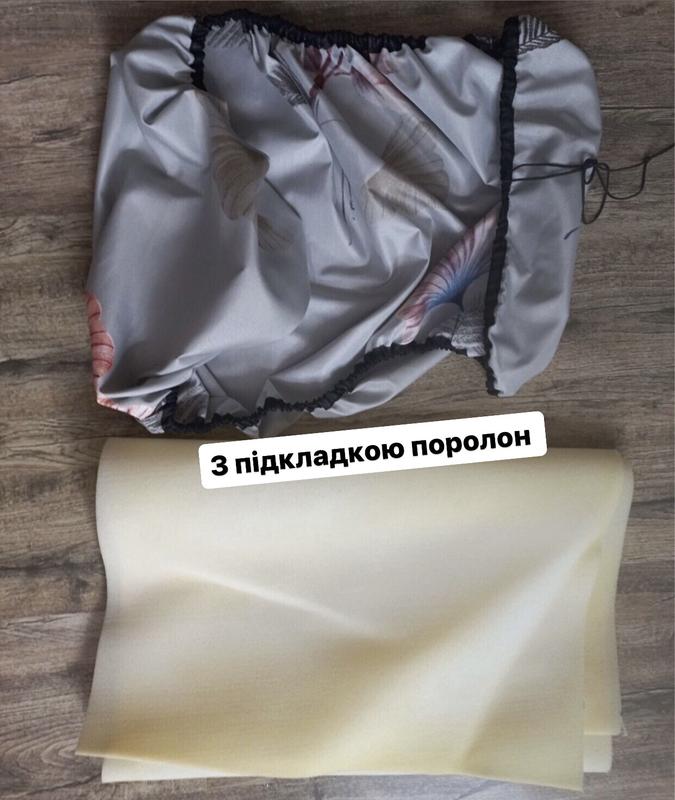 По всьому краю тасьма, всередині тасьми — резинка.Підкладка поролон йде окремо від чохла, вставляється в чохол.