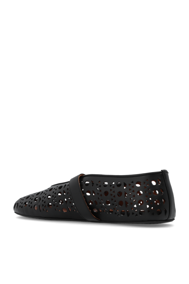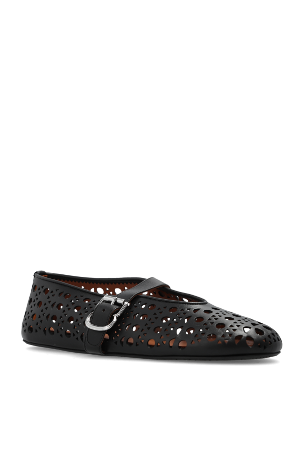 Black ballet flats from Alaia. Made of lamb leather, this pair fastens with a strap with a silver-tone metal buckle on the side and is enriched by the brand’s signature laser-cut perforations with openwork details.