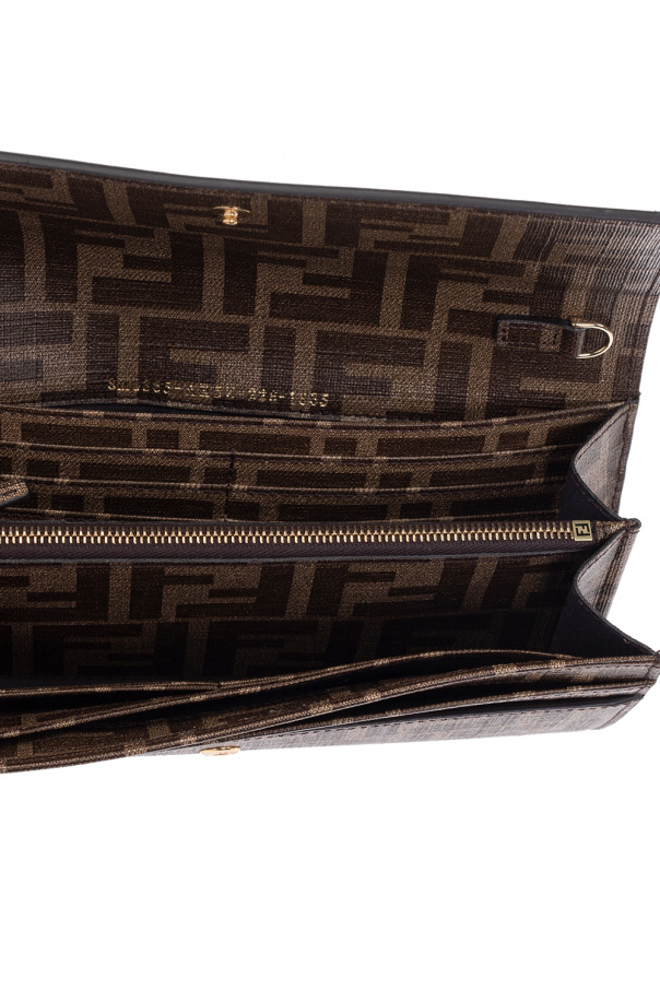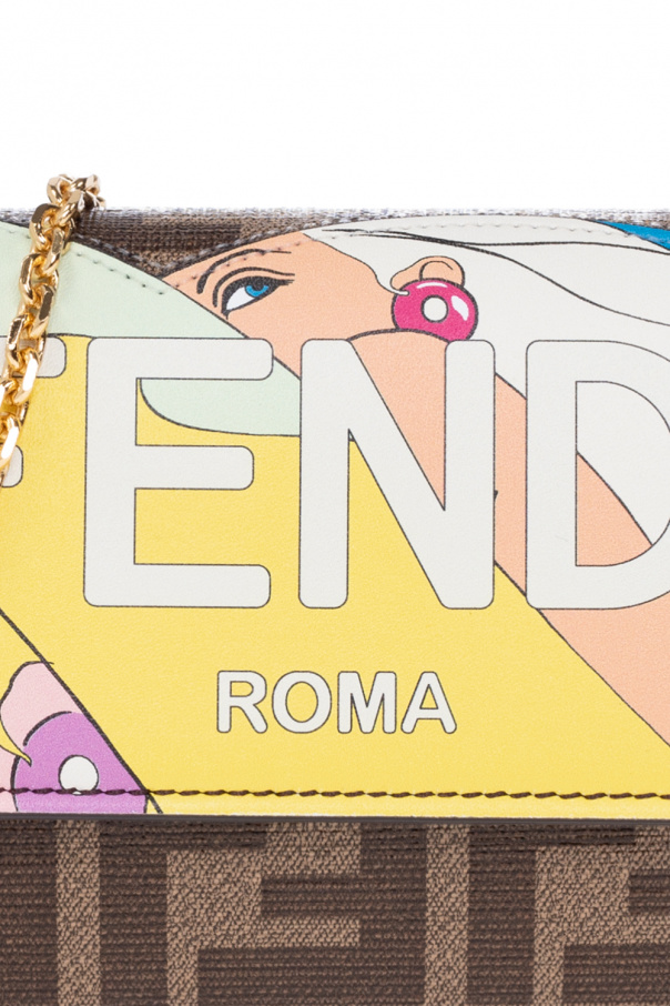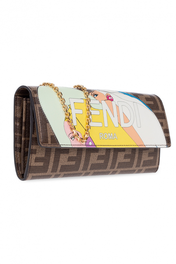 Beige and brown wallet on a chain from Fendi. Crafted from monogrammed canvas, this design features a snap fastening, a patch with a colourful logo print on the front, gold-tone metal hardware and two bill compartments, one zip coin pocket, four slip pockets and ten card slots inside.
