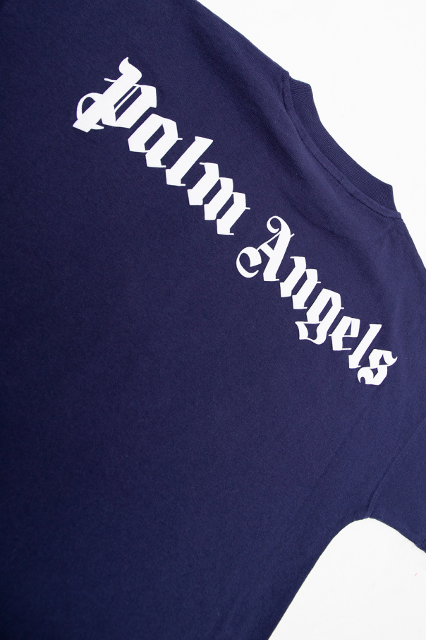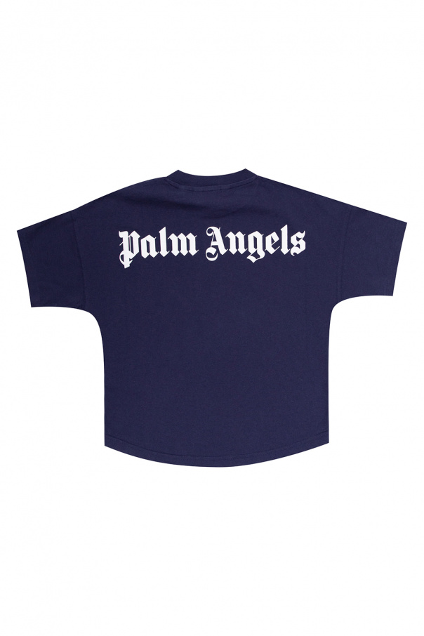 Navy blue crewneck T-shirt from Palm Angels Kids. Made of cotton, this style features short sleeves, an elasticated collar and a white graphic print with the brand's logo.