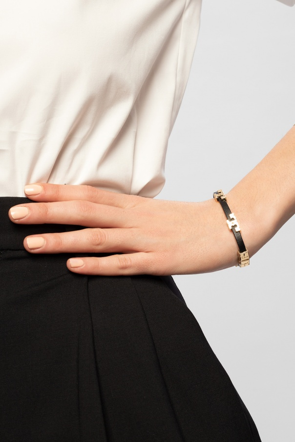 Black bracelet from Tory Burch. Crafted from leather, this piece features a decorative closure and logo appliqués finished with 18k gold.