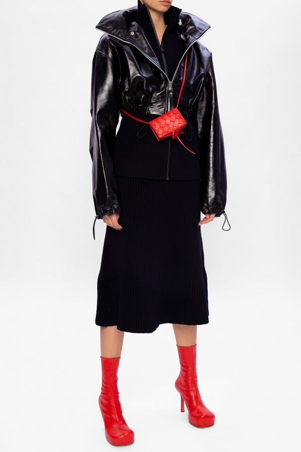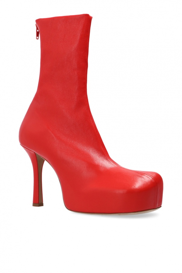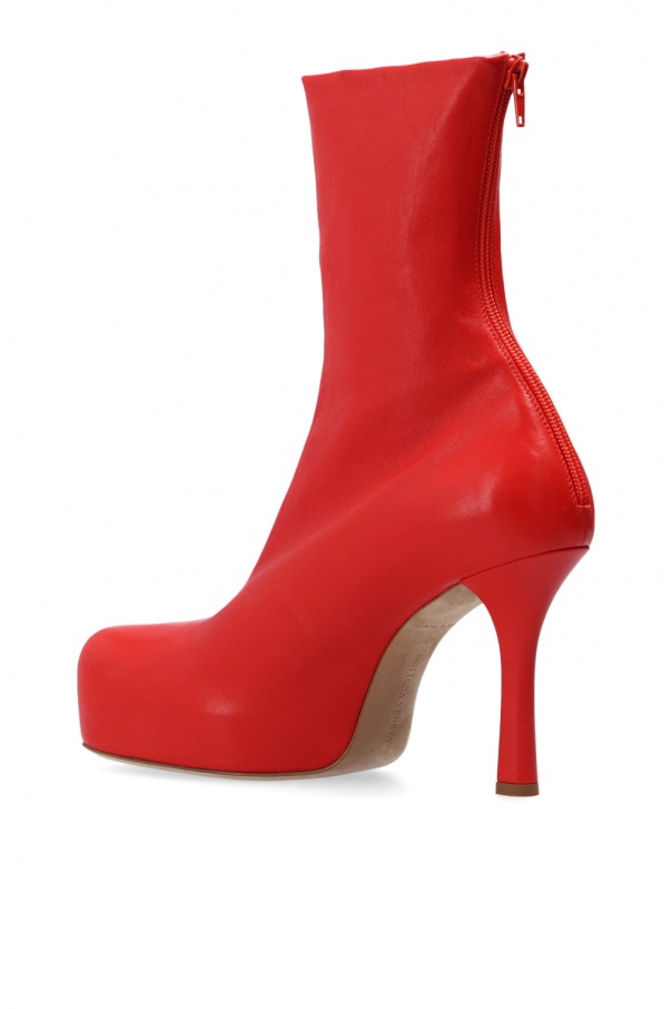 Red ‘BV Bold’ heeled ankle boots from Bottega Veneta. Crafted from lamb leather, this pair is set on a light brown leather sole and fastens via zip closure on the back.
