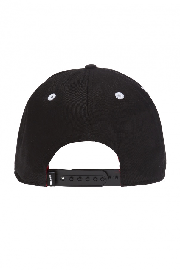 Black baseball cap from Diesel. Made of cotton. Front decorated with a white and red embroidered logo. Adjustable strap at the back.
