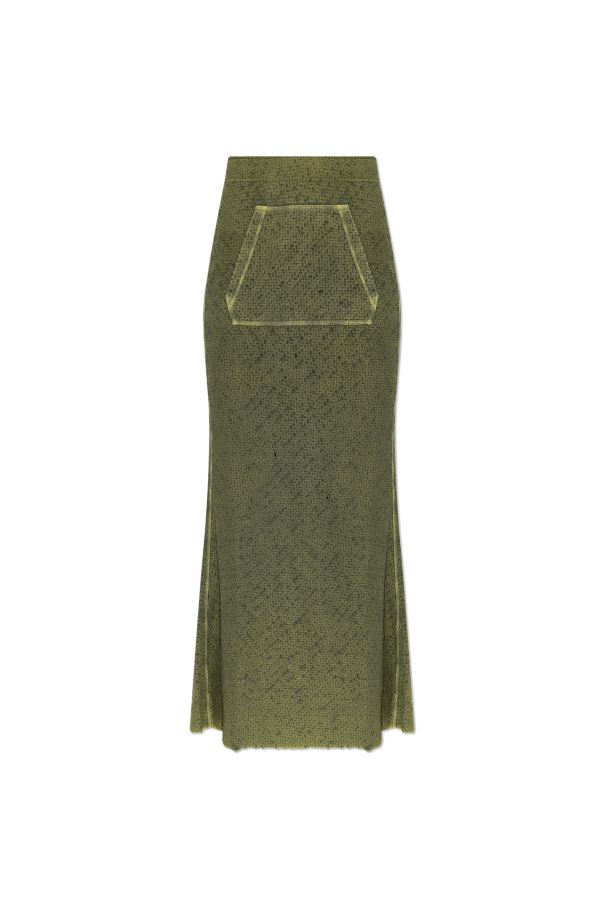 Green ‘O-ZAL’ skirt from Diesel. Cut with a flared silhouette, this style features a silver-tone logo patch on the front, distressed effects, light green stitching, a drawstring waistband, and a slip pocket on the front.