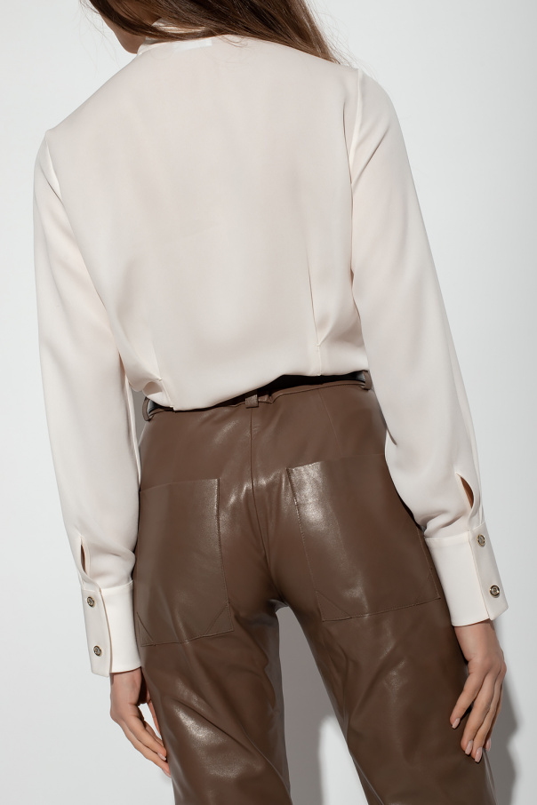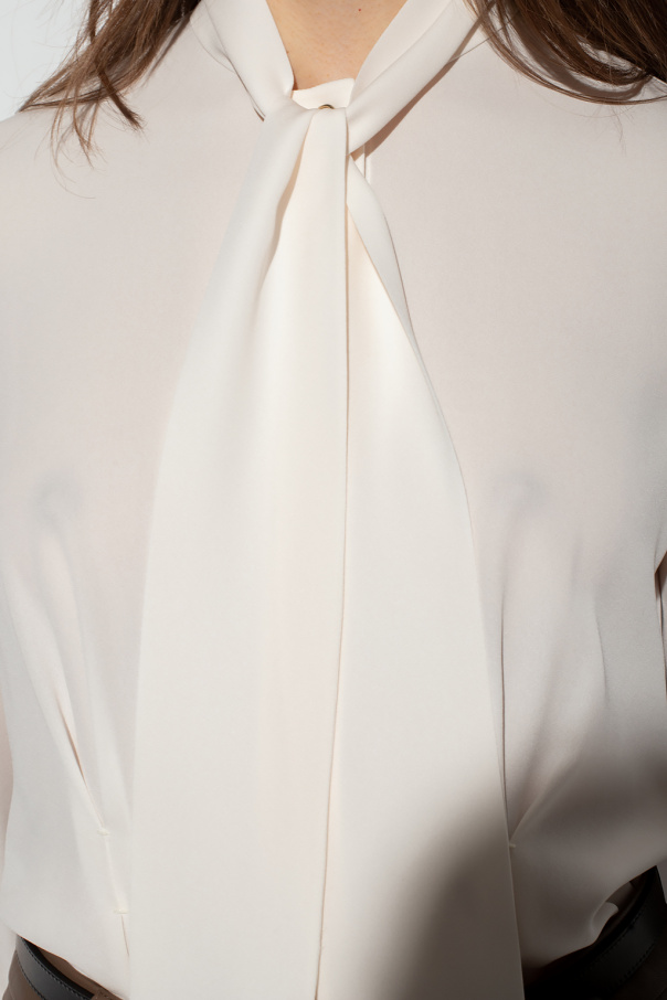 Cream shirt from Salvatore Ferragamo. Made of silk, this garment features button fastenings with a concealed placket, decorative tie neck and long sleeves with button cuffs.