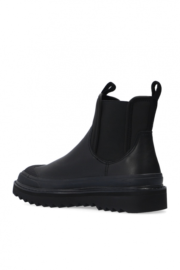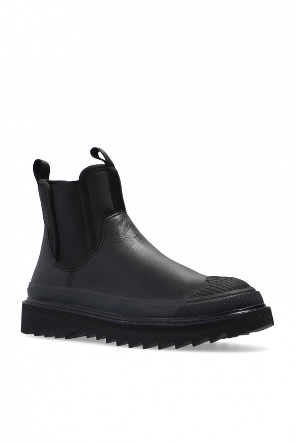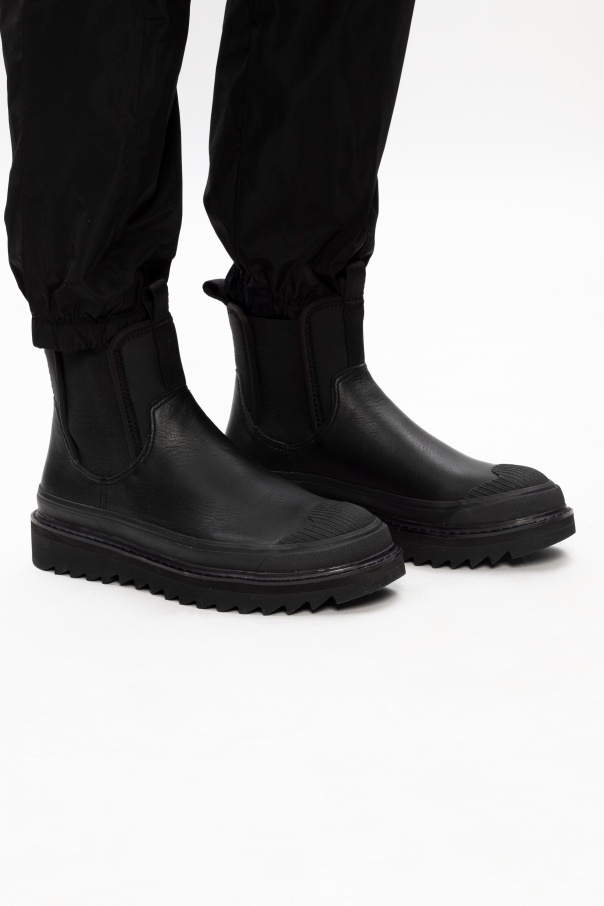 Black platform ankle boots from Diesel. This slip-on design features a black logo print and a black foam sole.