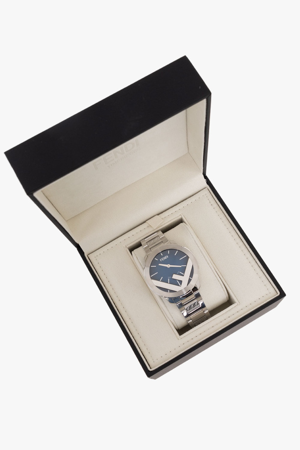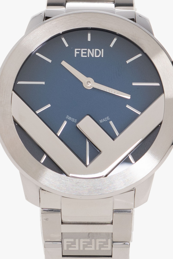 Silver-tone watch from Fendi. It features a 41 mm stainless steel case, stainless steel F insert, curved off-centre blue sunray dial with silver colored indices and hands as well as an adjustable bracelet with an engraved FF motif and clasp fastening.