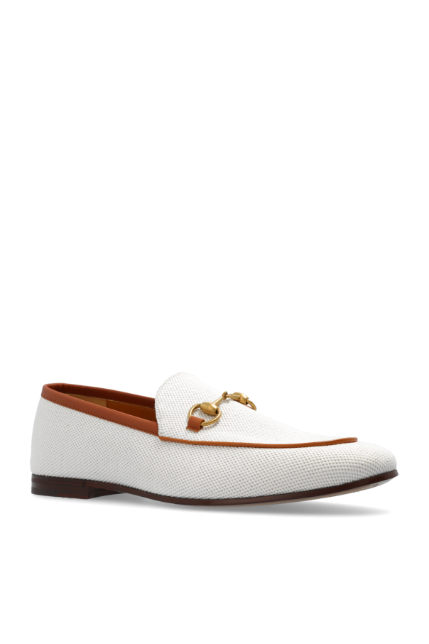 White and brown loafers from Gucci. Made from cotton and linen and trimmed with leather, this model sits on a brown leather sole and showcases antiqued gold-tone horsebit hardware on the front.