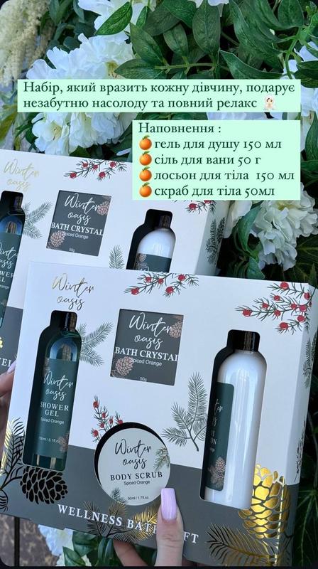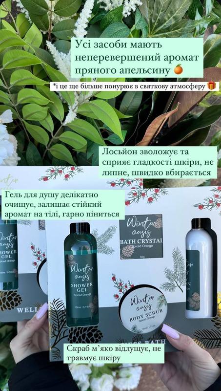В составе: лосьон для тела, гель для душа, скраб для тела