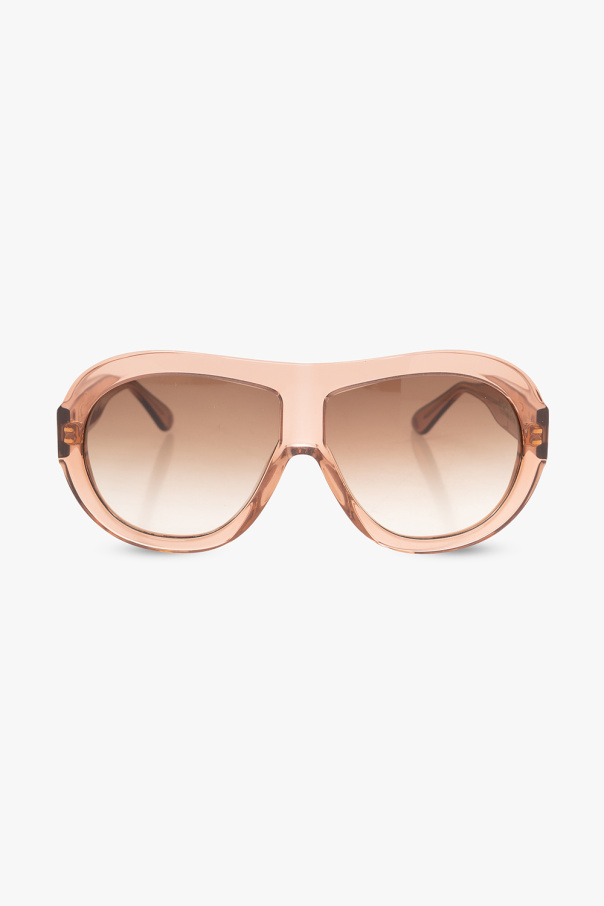 Beige and maroon ‘Moroder’ round sunglasses from Emmanuelle Khanh. Handcrafted in France with a transparent finish, this model features the brand\'s ‘Signature Line Monogram’ logo in gold-plated metal placed under resin and brown gradient lenses with 100% UV protection. Comes with a case, whose colour is individually selected for each pair of glasses.