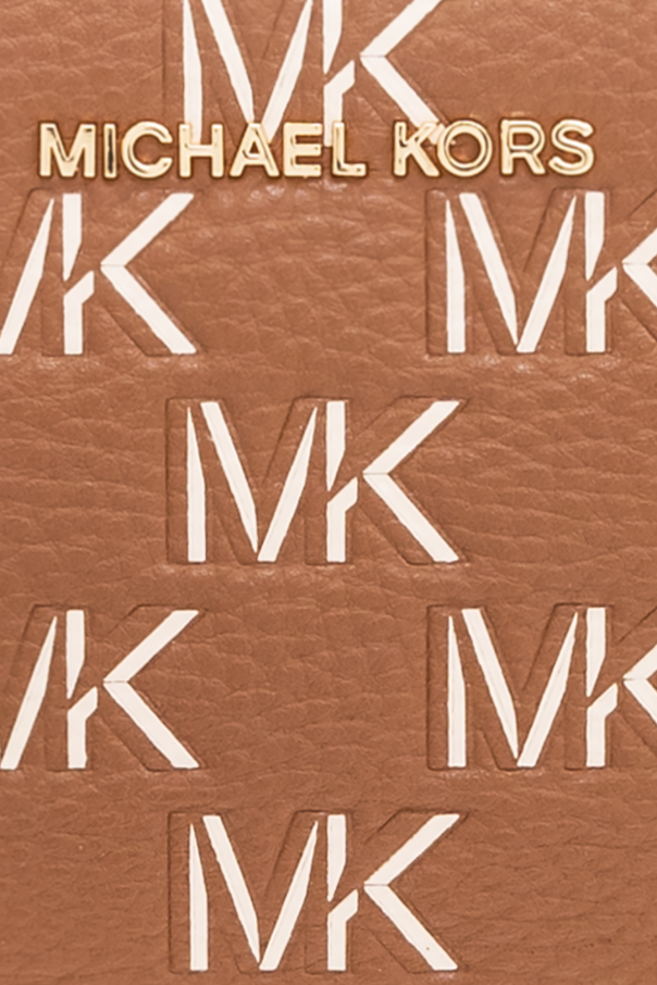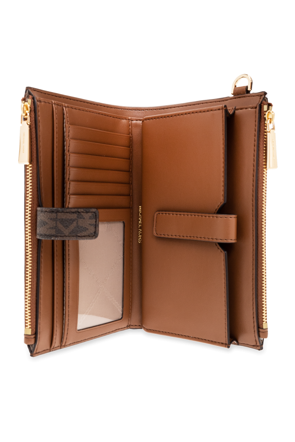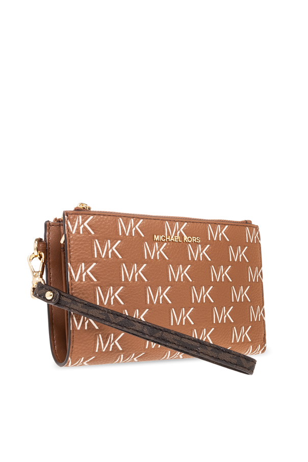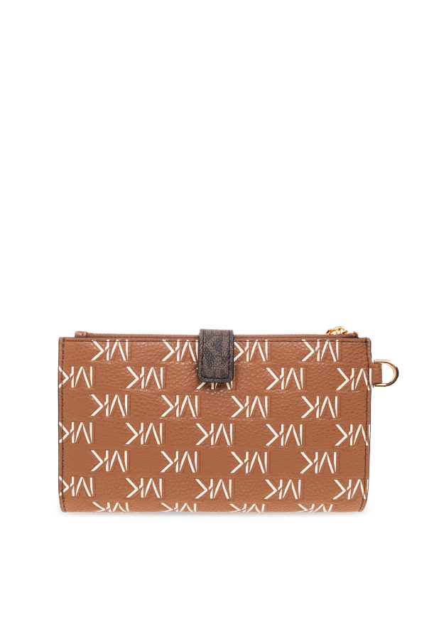 Brown wallet from Michael Michael Kors. Crafted from coated canvas accentuated with a cream monogram, this design secures with a snap and features a metal logo plaque on the front. It is complete with a detachable wrist strap, gold-tone metal hardware and two zip pockets, one bill compartment, one snap-fastened phone holder, two slip pockets and seven card slots inside.