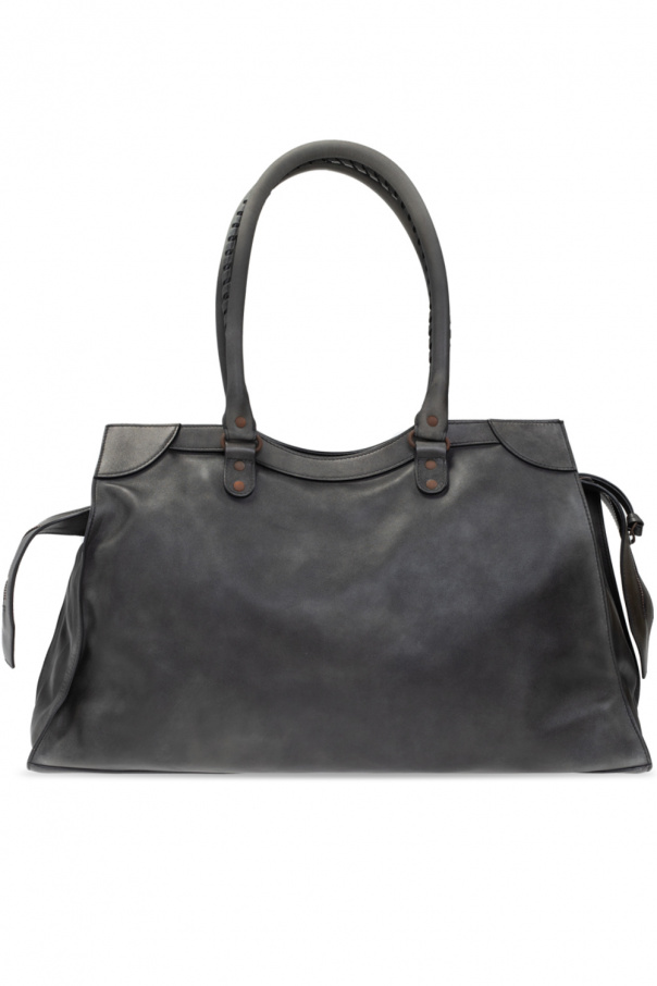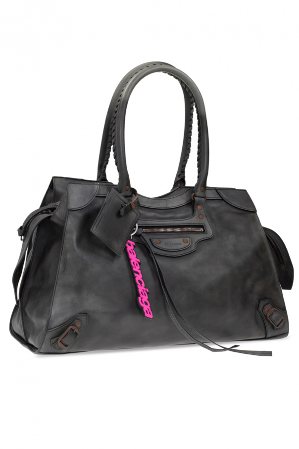 Grey 'Neo Classic City L' holdall bag from Balenciaga. Made of leather, this model fastens with a two-way zip, this model is complete with a front zip pocket, embossed logo, detachable logo charm, two half-round handles, metal hardware with a decorative rust effect as well as one internal compartment with one slip pocket.