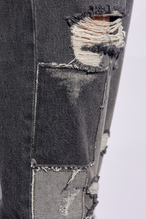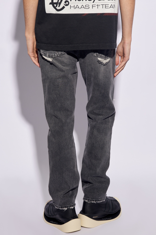 Dark grey jeans from Palm Angels. Made from cotton, this pair falls with tapered legs and features button fastenings, classic five-slip pockets, distressed effects and logo embroidery.