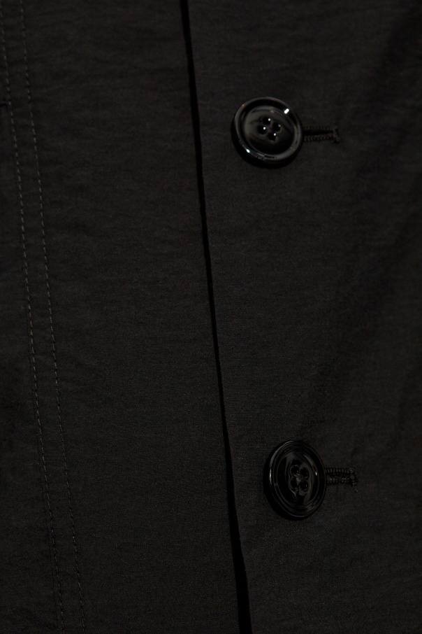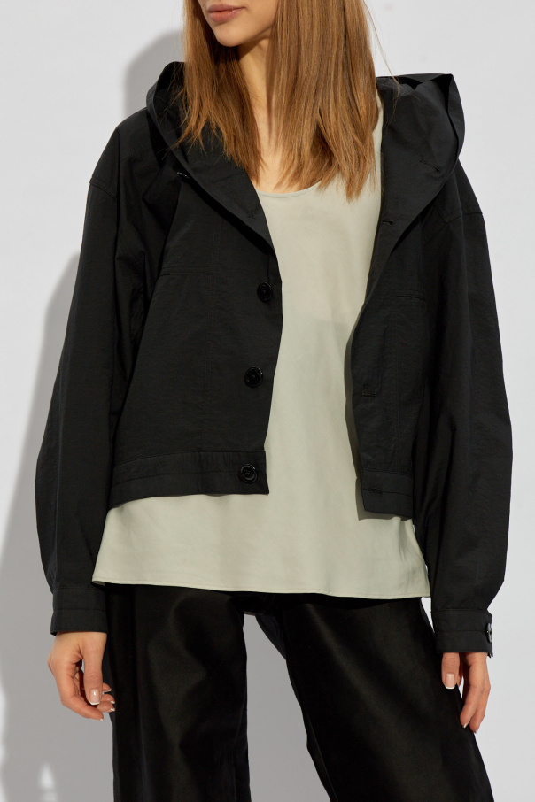 Black hooded jacket from Lemaire. Made from a cotton blend, this loose-fitting design features buttons, two slip pockets, ribbed hem and long sleeves with buttoned cuffs.