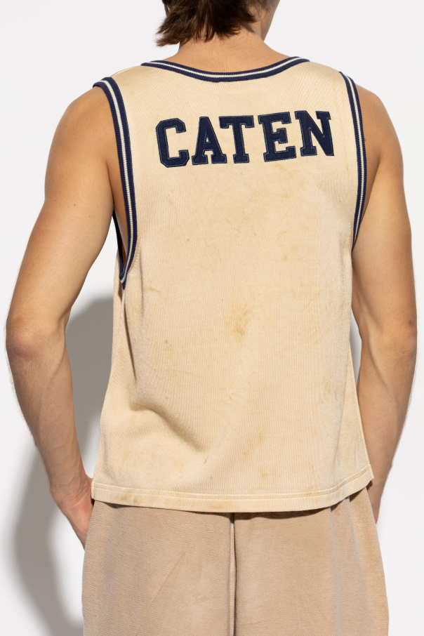 Introducing the Dsquared2 Sleeveless T-Shirt from the exclusive collection of premier menswear. This refined piece, presented in a dominant beige hue, exudes sophistication and comfort. Expertly crafted from a blend of viscose and cotton, the fabric promises unparalleled softness and ease. The t-shirt features a striking navy \'95\' print on the front and a matching \'CATEN\' inscription on the back, epitomizing sport-chic elegance. The meticulously finished edges, adorned with navy trims and white stripes around the neckline and armholes, lend a sporty flair to the garment. Its loose, sleeveless design makes it an ideal choice for warmer days or athletic pursuits, effortlessly combining style with functionality. Why Choose This Product? Luxurious blend of viscose and cotton for ultimate comfort. Unique \'95\' and \'CATEN\' prints in contrasting navy. Stylish navy trims with white stripes adding a sporty touch. Perfectly suited for casual and athletic wear. Designed by the visionary duo, Dan and Dean Caten of Dsquared2.