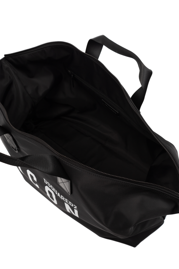 Black duffel bag from Dsquared2. Crafted from fabric, this design fastens via a zip and showcases a printed white logo on the front, two half-round handles and one internal compartment with one zip pocket and two slip pockets.