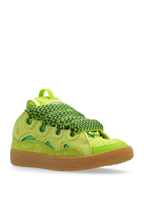 Green ‘Curb’ sneakers from Lanvin. Made of leather, mesh and rubber, this lace-up pair features an embossed logo and patch in silver-tone, perforations on the front, decorative wide shoelaces with a geometric pattern and brown rubber sole.