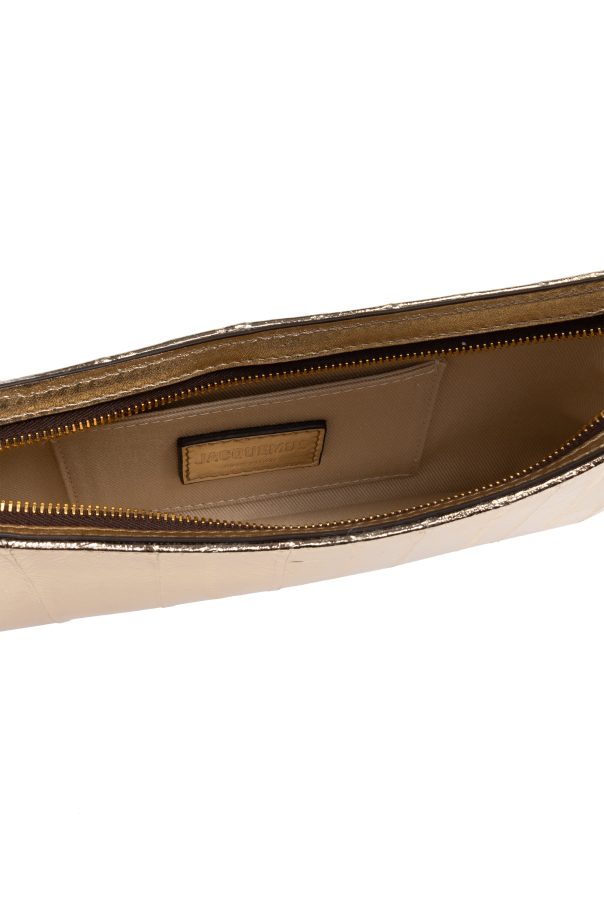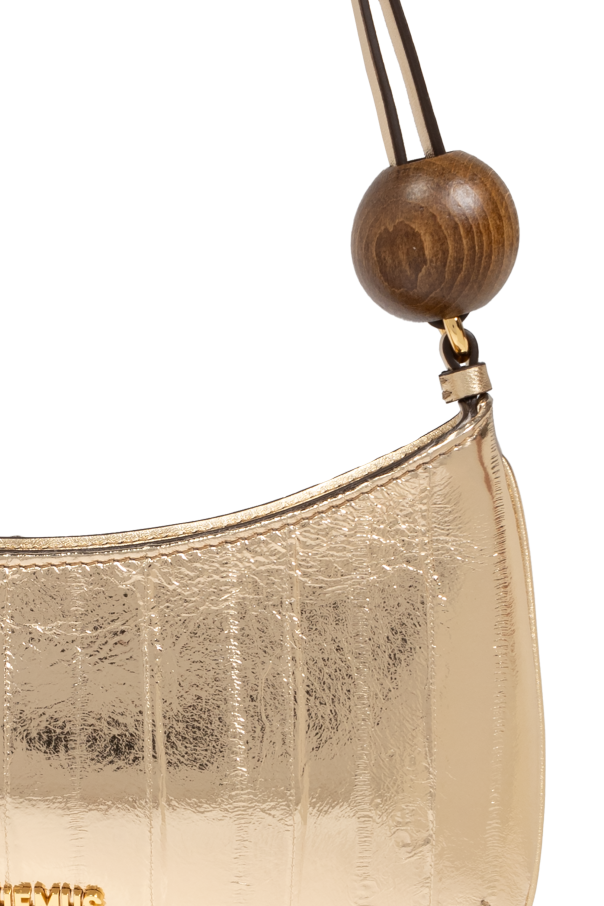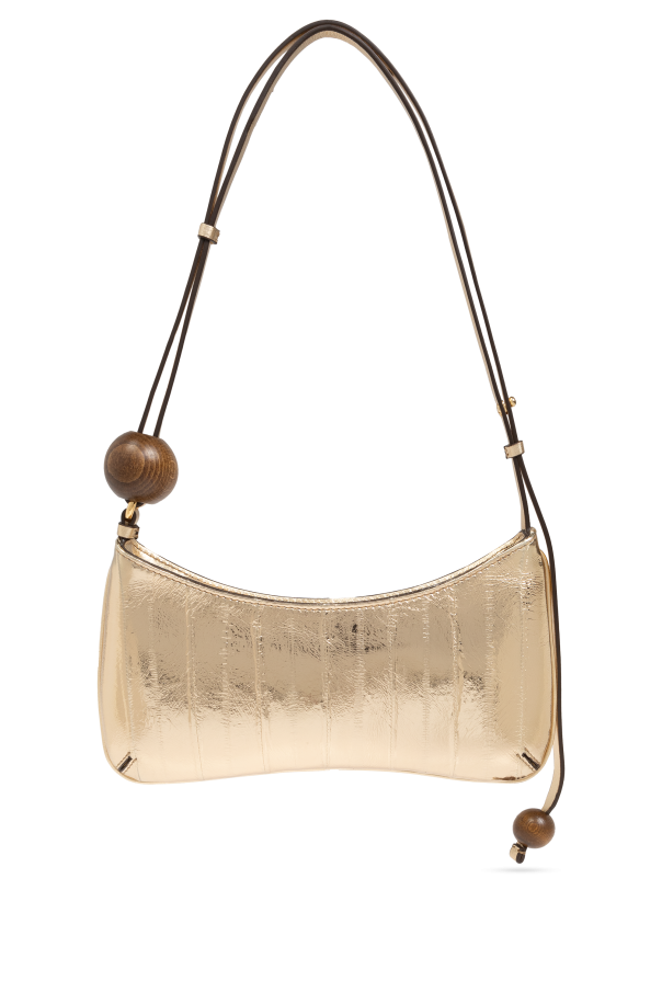 Introducing the exclusive Le Bisou Perle shoulder bag from the renowned designer, Jacquemus. This opulent creation, enveloped in a lustrous golden hue, epitomizes elegance and sophistication. Crafted from a luxurious fabric with a metallic finish, this rectangular bag features rounded edges at the top, exuding a modern yet timeless appeal. The surface is adorned with subtle vertical stitching, adding a delicate pattern to its refined design. The Le Bisou Perle boasts a slender, dark-hued strap, accented with distinctive large wooden beads at both ends, providing a striking contrast to the bag\'s golden exterior. The designer\'s emblem, in matching gold, graces the front, while a golden zipper secures the main compartment, ensuring both style and functionality. Inside, the bag reveals a neutral-toned lining with a convenient zippered pocket, enhancing its practicality. This exquisite bag is versatile, suitable for both formal events and everyday elegance, making it a quintessential accessory for any discerning woman. Why Choose This Product? Exquisite metallic gold finish for a luxurious appearance. Unique wooden bead accents on the strap for an artistic touch. Functional design with a secure zippered main compartment and interior pocket. Versatile style suitable for various occasions. Signature design by the acclaimed Jacquemus.