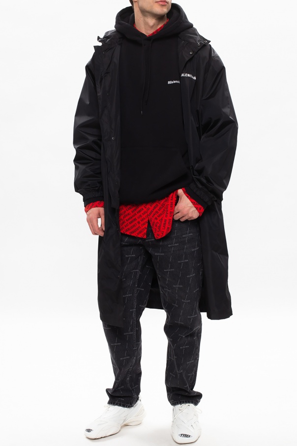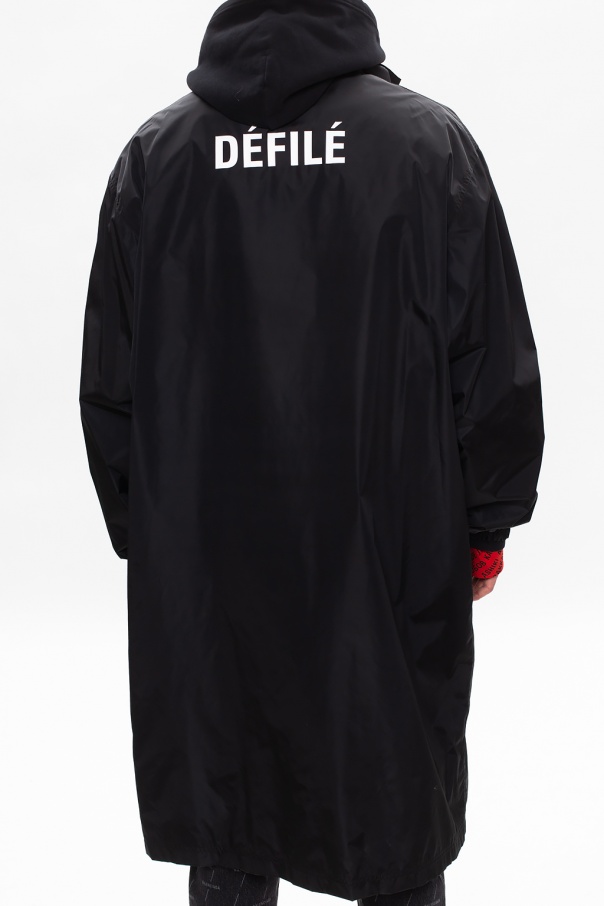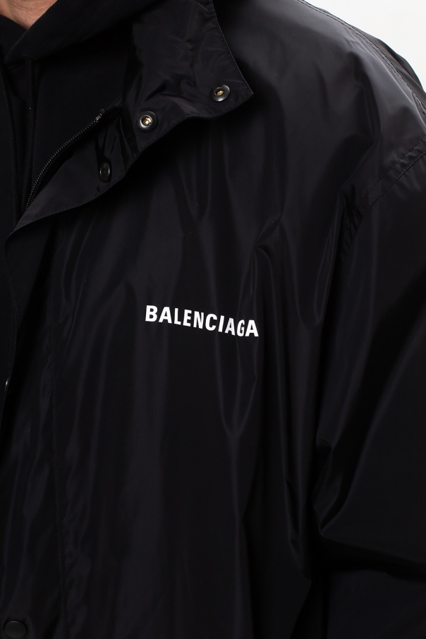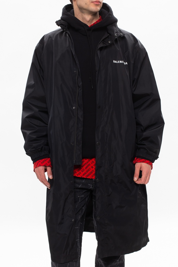 Black coat from Balenciaga. Crafted in shiny nylon with an oversize silhouette, this style fastens via zip and snap-buttons and showcases a hood which conceals in the collar, two zipped pockets on the front, white logo of the brand printed on the chest and white lettering printed on the back.