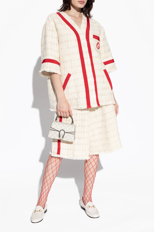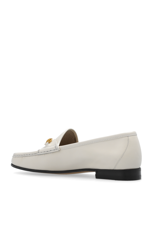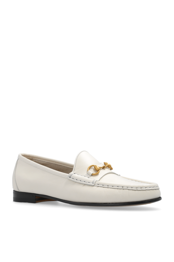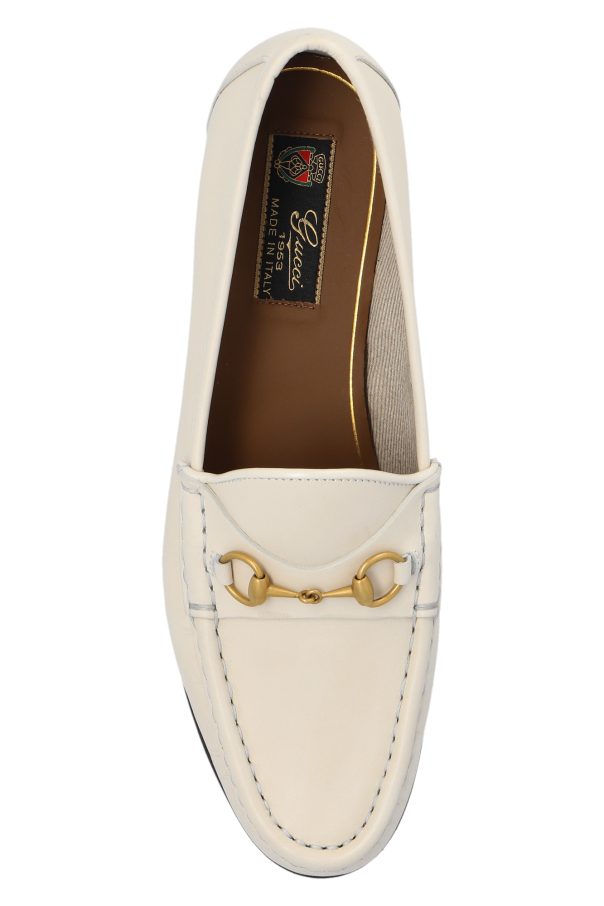 Cream loafers from Gucci. Made of leather, this pair features the brand\'s signature horsebit in antique gold-tone and leather sole in brown and black.