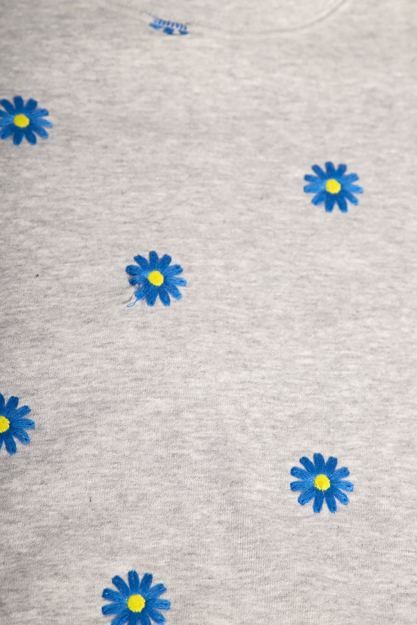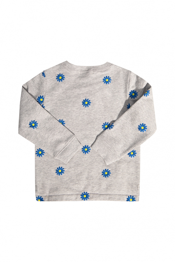Grey crewneck sweatshirt from Stella McCartney Kids. Crafted from cotton jersey, this style showcases embroidered blue and yellow appliqués and rib detailing on the bottom hem and cuffs.