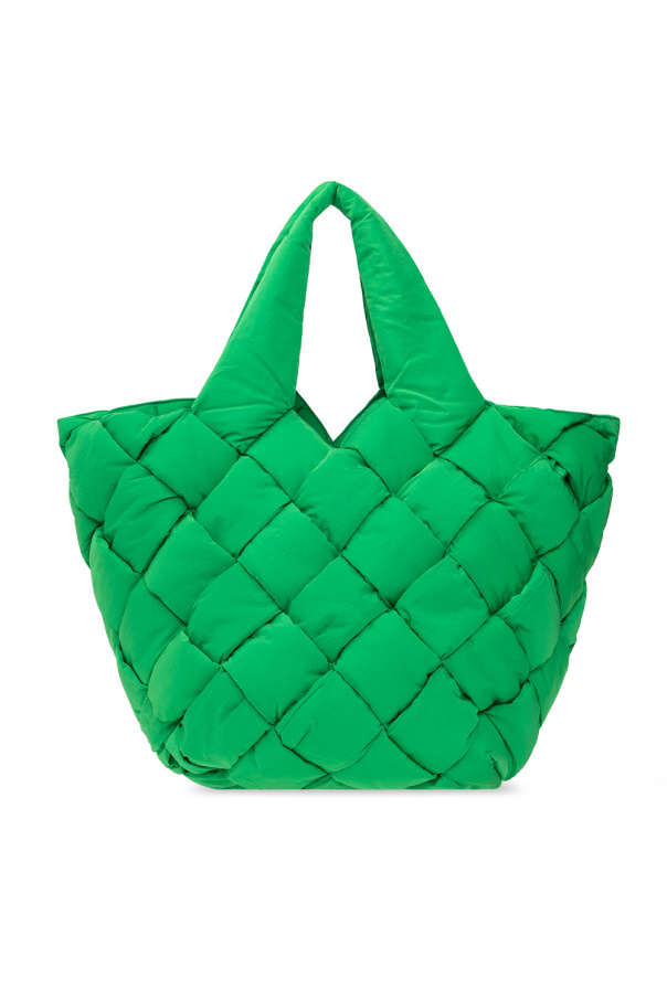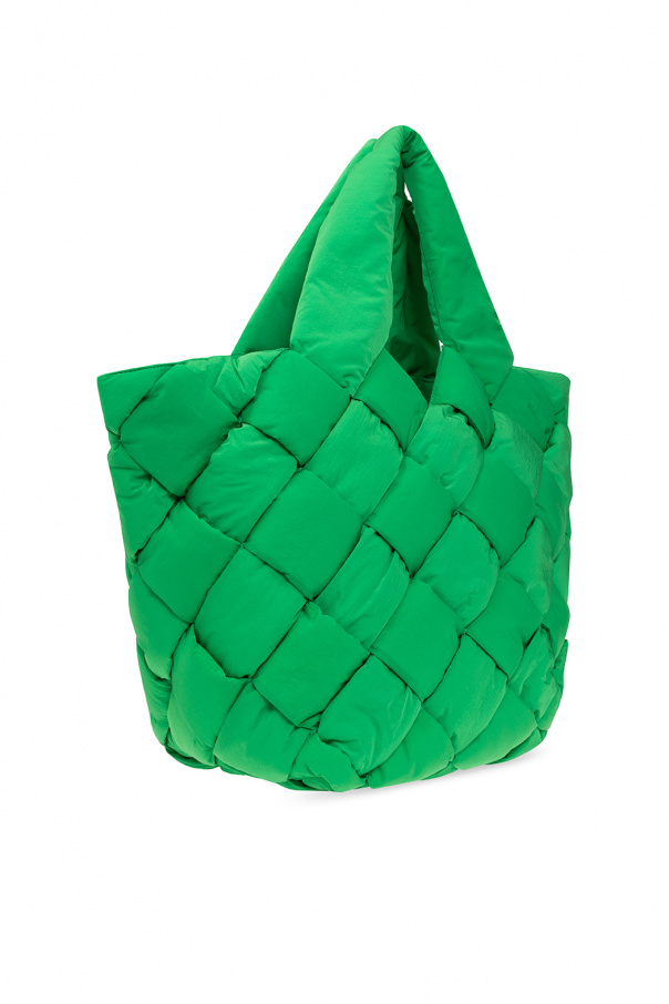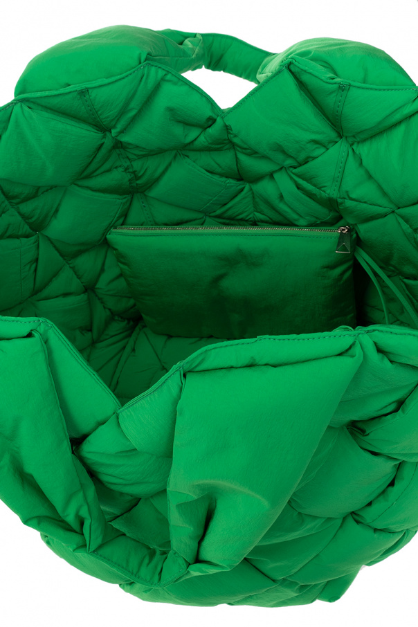 Green ‘Cassette Large’ shopper bag from Bottega Veneta. Made of padded technical fabric with the iconic Intreccio weave, this model features an adjustable shoulder strap, two half-round handles, detachable zipped pouch with a zip and silver-tone metal hardware.