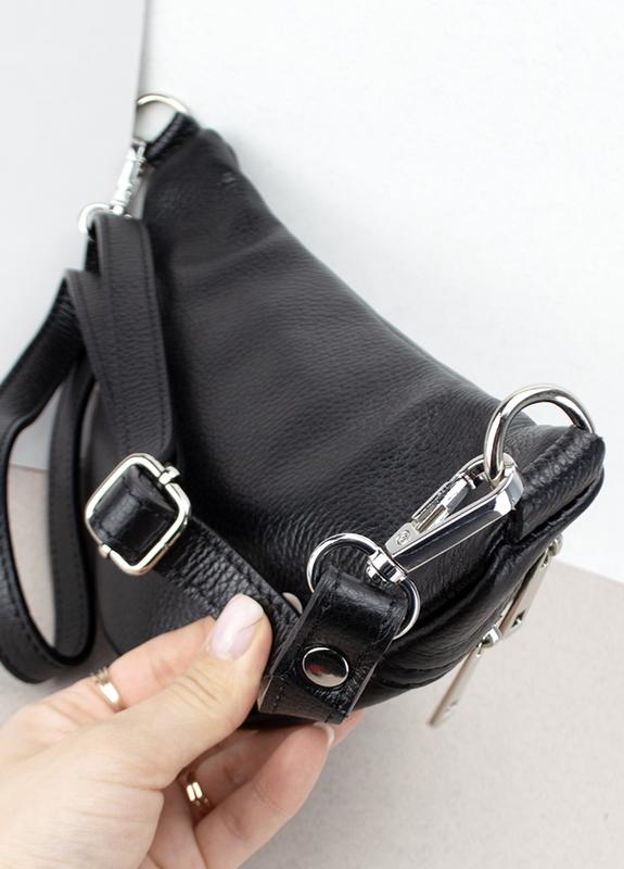 Изготовлена из натуральной кожи флотар, она оснащена одним основным отделением с потайным карманом, закрывающимся металлической молнией, а также карманом на молнии на лицевой стороне. Внутренний подклад выполнен из прочного текстиля. В процессе изготовления использована только качественная металлическая фурнитура, включая молнии, замки и карабины. Длина ремешка регулируется, обеспечивая максимальный комфорт при ношении.