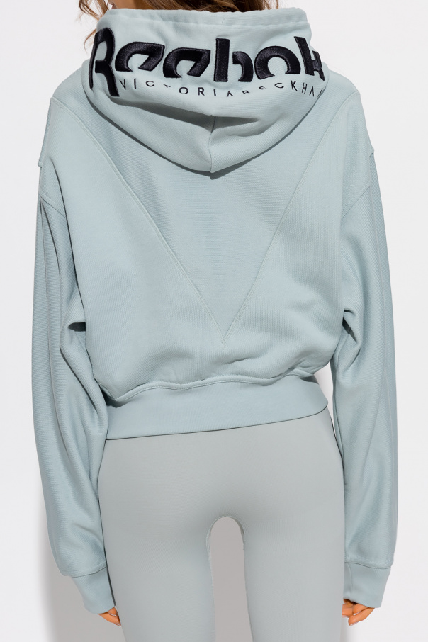 Greyish blue loose-fitting sweatshirt from Reebok x Victoria Beckham. Crafted from cotton, this garment features a drawstring hood, black logo embroidery and ribbed trims at the hem and cuffs.